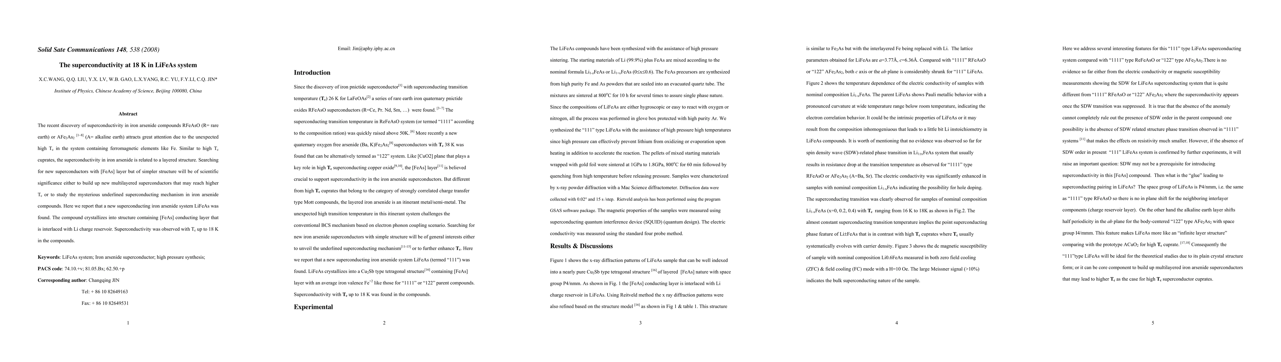 Summary: Researchers discovered a new iron arsenide superconductor, LiFeAs, with a tetragonal structure and a critical temperature (Tc) of up to 18 K, marking it as a simple 111 type layered iron arsenide analogous to copper oxides.