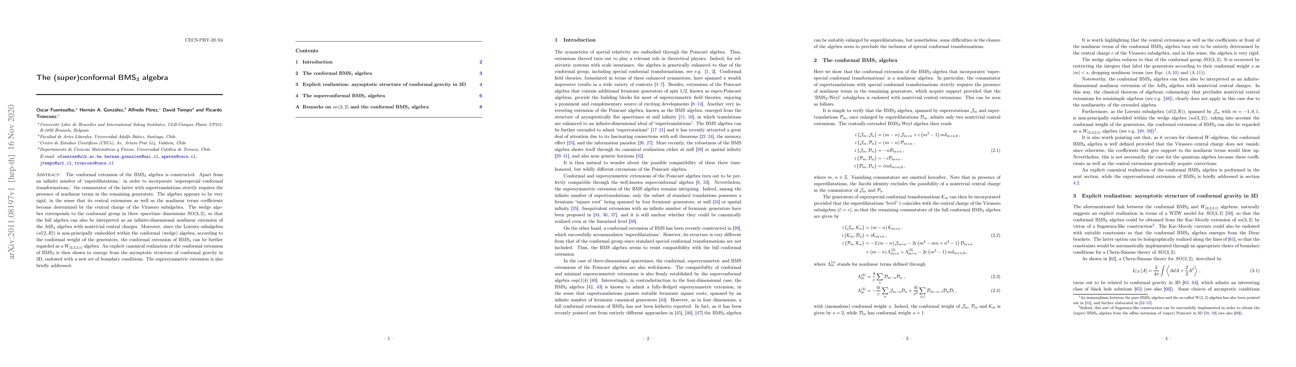 The paper constructs the conformal extension of the BMS$_3$ algebra, introducing superdilatations and nonlinear terms to incorporate superspecial conformal transformations. The resulting algebra is rigid, with its central extensions and coefficients determined by the Virasoro subalgebra's central charge, and corresponds to the conformal group $SO(3,2)$ in three dimensions.