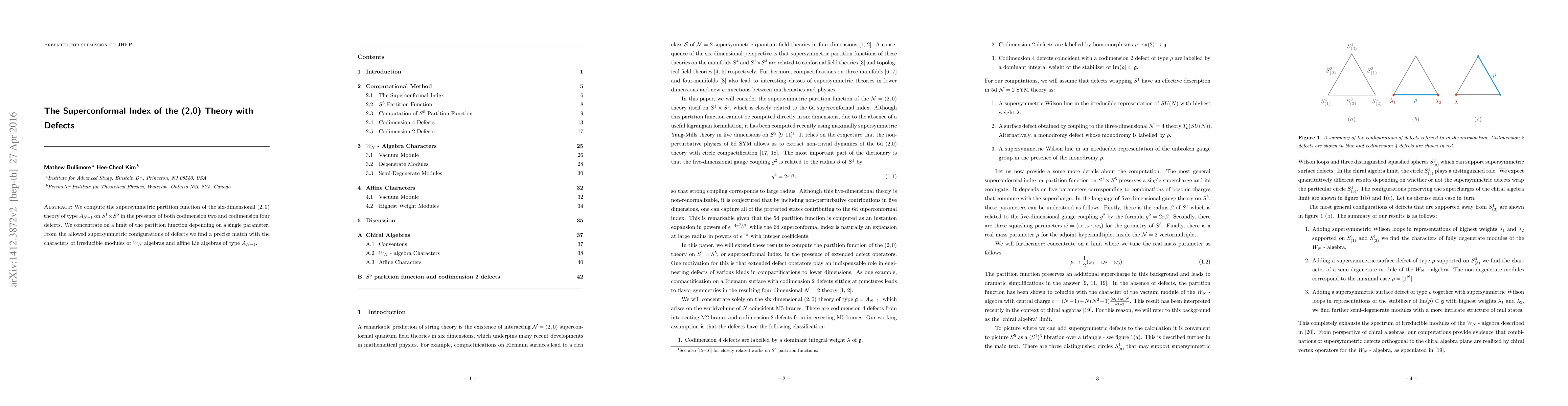 This paper computes the supersymmetric partition function of a six-dimensional $(2,0)$ theory on $S^1 \times S^5$ with codimension two and four defects, finding a match between the partition function and characters of $W_N$ and $A_{N-1}$ affine Lie algebras. The study focuses on a specific limit of the partition function.
