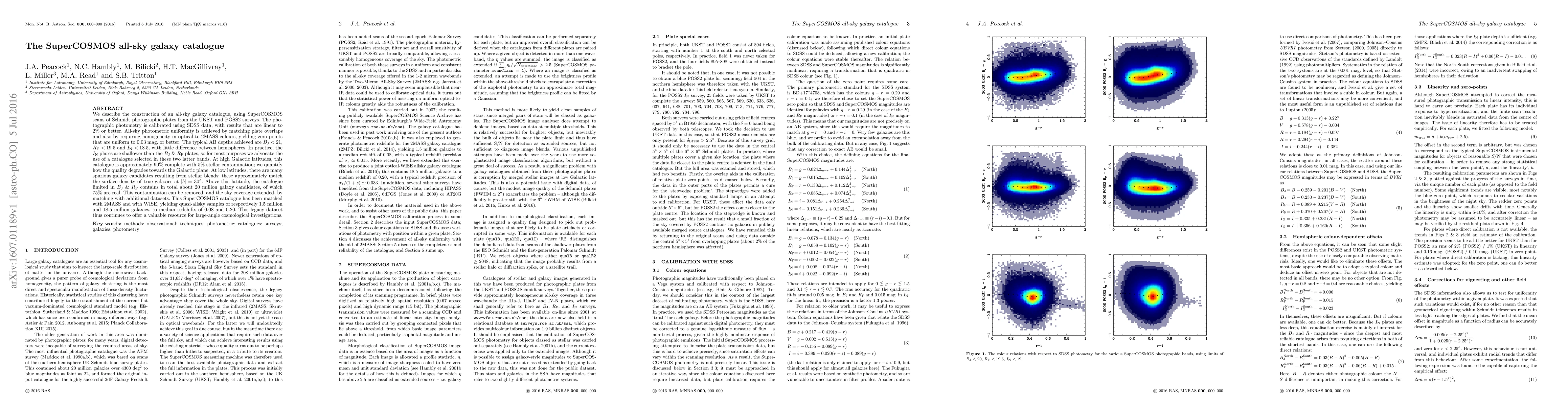 The SuperCOSMOS all-sky galaxy catalogue compiles galaxy data from SuperCOSMOS scans using UKST and POSS2 surveys, achieving photometric uniformity and depths of B_J<21, R_F<19.5, and I_N<18.5. It provides a valuable resource for cosmological studies, with 20 million galaxy candidates, 75% of which are real, and matched with 2MASS and WISE datasets.
