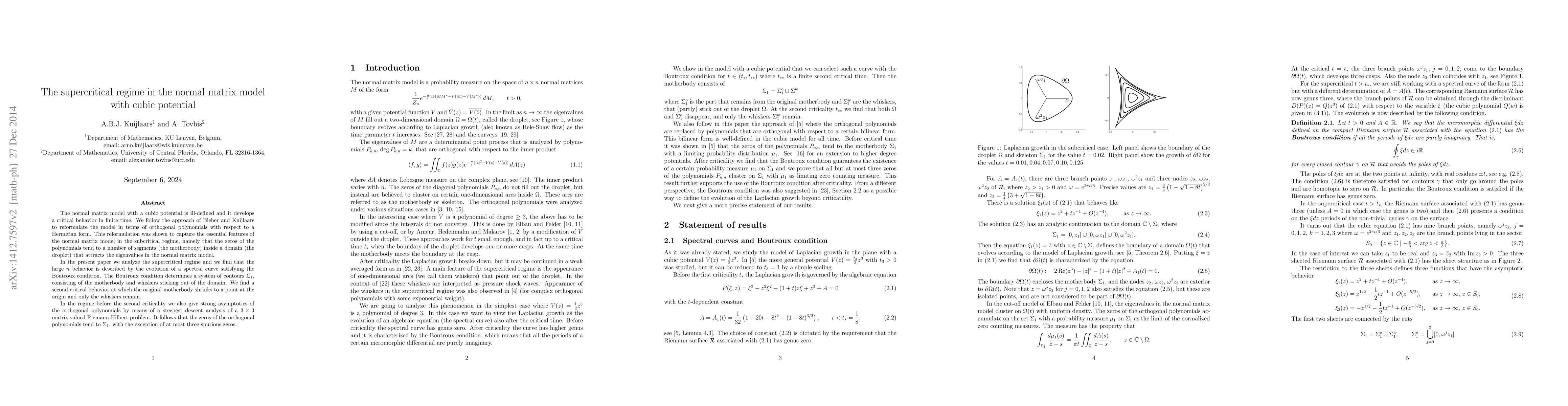 The normal matrix model with a cubic potential is ill-defined and it develops a critical behavior in finite time. We follow the approach of Bleher and Kuijlaars to reformulate the model in terms of orthogonal polynomials with respect to a Hermitian form. This reformulation was shown to capture the essential features of the normal matrix model in the subcritical regime, namely that the zeros of the polynomials tend to a number of segments (the motherbody) inside a domain (the droplet) that attracts the eigenvalues in the normal matrix model. In the present paper we analyze the supercritical regime and we find that the large $n$ behavior is described by the evolution of a spectral curve satisfying the Boutroux condition. The Boutroux condition determines a system of contours $\Sigma_1$, consisting of the motherbody and whiskers sticking out of the domain. We find a second critical behavior at which the original motherbody shrinks to a point at the origin and only the whiskers remain. In the regime before the second criticality we also give strong asymptotics of the orthogonal polynomials by means of a steepest descent analysis of a $3 \times 3$ matrix valued Riemann-Hilbert problem. It follows that the zeros of the orthogonal polynomials tend to $\Sigma_1$, with the exception of at most three spurious zeros.