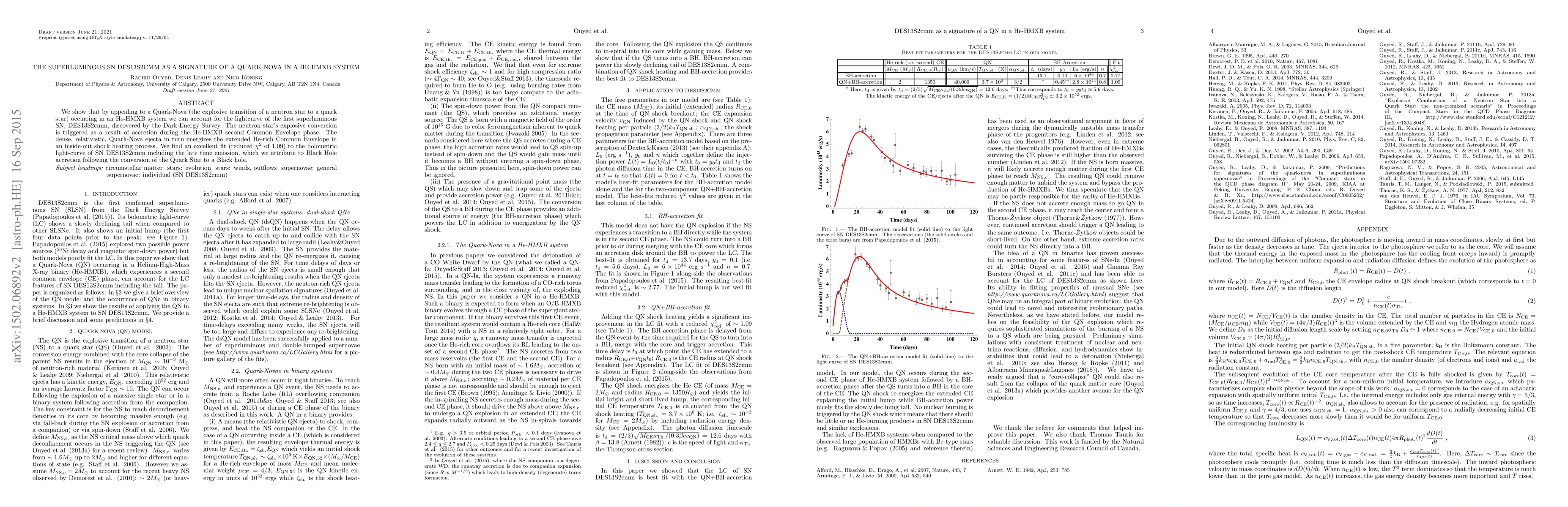 We show that by appealing to a Quark-Nova (the explosive transition of a neutron star to a quark star) occurring in an He-HMXB system we can account for the lightcurve of the first superluminous SN, DES13S2cmm, discovered by the Dark-Energy Survey. The neutron star's explosive conversion is triggered as a result of accretion during the He-HMXB second Common Envelope phase. The dense, relativistic, Quark-Nova ejecta in turn energizes the extended He-rich Common Envelope in an inside-out shock heating process. We find an excellent fit (reduced chi^2 of 1.09) to the bolometric light-curve of SN DES13S2cmm including the late time emission, which we attribute to Black Hole accretion following the conversion of the Quark Star to a Black hole.