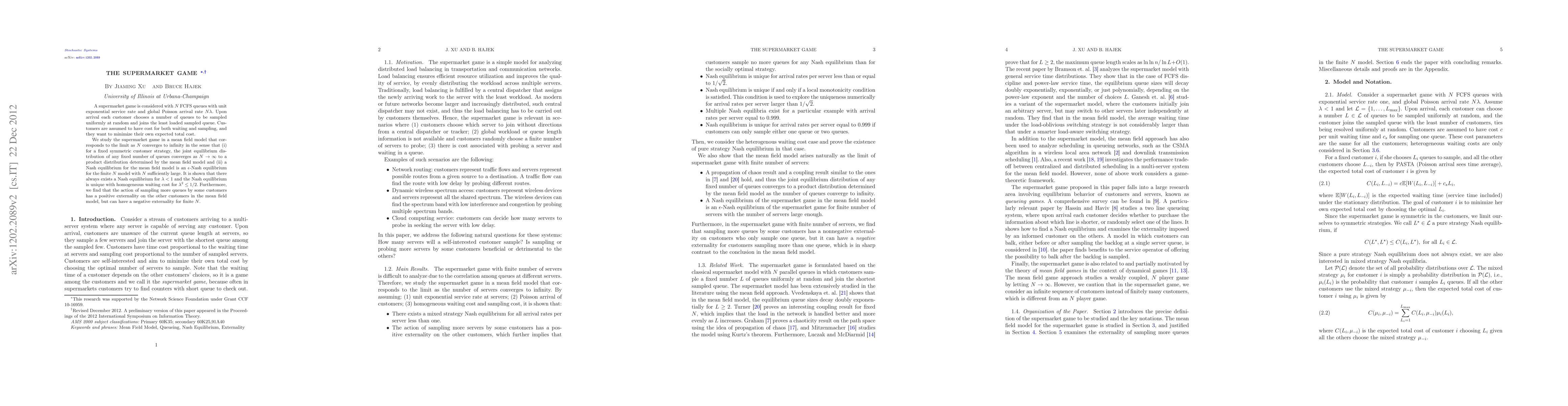 A supermarket game is considered with $N$ FCFS queues with unit exponential service rate and global Poisson arrival rate $N \lambda$. Upon arrival each customer chooses a number of queues to be sampled uniformly at random and joins the least loaded sampled queue. Customers are assumed to have cost for both waiting and sampling, and they want to minimize their own expected total cost. We study the supermarket game in a mean field model that corresponds to the limit as $N$ converges to infinity in the sense that (i) for a fixed symmetric customer strategy, the joint equilibrium distribution of any fixed number of queues converges as $N \to \infty$ to a product distribution determined by the mean field model and (ii) a Nash equilibrium for the mean field model is an $\epsilon$-Nash equilibrium for the finite $N$ model with $N$ sufficiently large. It is shown that there always exists a Nash equilibrium for $\lambda <1$ and the Nash equilibrium is unique with homogeneous waiting cost for $\lambda^2 \le 1/2$. Furthermore, we find that the action of sampling more queues by some customers has a positive externality on the other customers in the mean field model, but can have a negative externality for finite $N$.