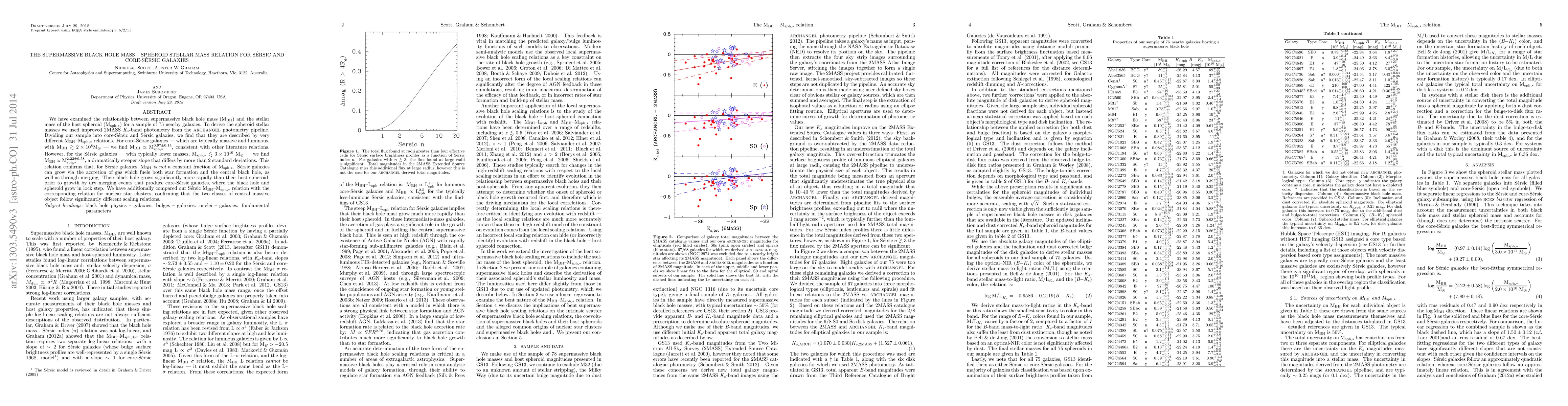 We have examined the relationship between supermassive black hole mass (M$_{BH}$) and the stellar mass of the host spheroid (M$_{sph,*}$) for a sample of 75 nearby galaxies. To derive the spheroid stellar masses we used improved 2MASS K$_s$-band photometry from the ARCHANGEL photometry pipeline. Dividing our sample into core-S\'ersic and S\'ersic galaxies, we find that they are described by very different M$_{BH}$-M$_{sph,*}$ relations. For core-S\'ersic galaxies - which are typically massive and luminous, with M$_{BH} \gtrsim 2x10^8 M_\odot$ - we find M$_{BH} \propto M_{sph,*}^{(0.97 \pm 0.14)}$, consistent with other literature relations. However, for the S\'ersic galaxies - with typically lower masses, M$_{sph,*} \lesssim 3x10^10 M_\odot$ - we find M$_BH \propto M_{sph,*}^{(2.22 \pm 0.58)}$, a dramatically steeper slope that differs by more than 2 standard deviations. This relation confirms that, for S\'ersic galaxies, M$_{BH}$ is not a constant fraction of M$_{sph,*}$. S\'ersic galaxies can grow via the accretion of gas which fuels both star formation and the central black hole, as well as through merging. Their black hole grows significantly more rapidly than their host spheroid, prior to growth by dry merging events that produce core-S\'ersic galaxies, where the black hole and spheroid grow in lock step. We have additionally compared our S\'ersic M$_{BH}$-M$_{sph,*}$ relation with the corresponding relation for nuclear star clusters, confirming that the two classes of central massive object follow significantly different scaling relations.