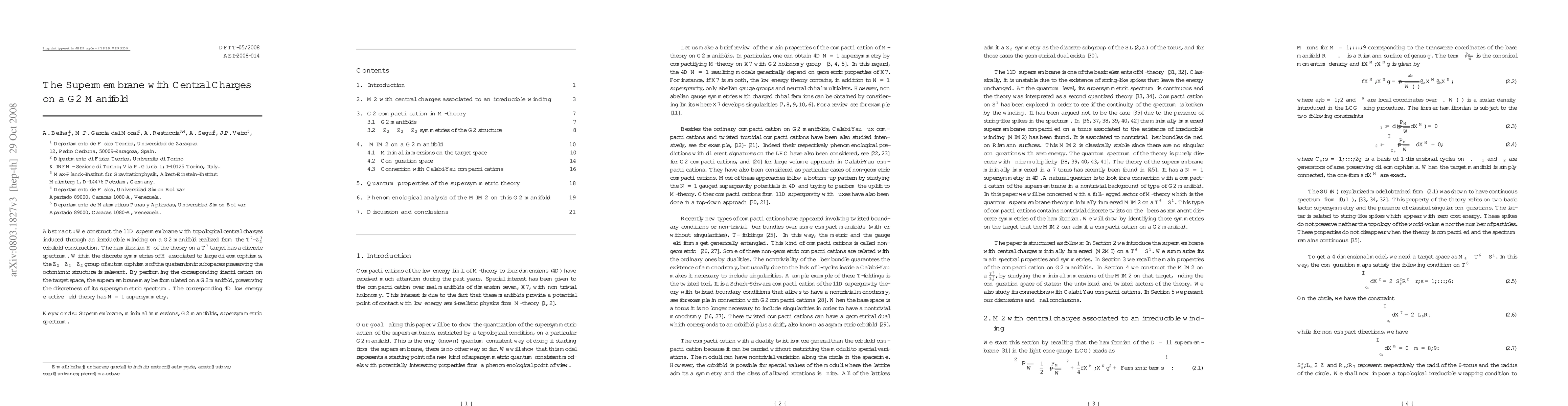 This paper constructs an 11D supermembrane with topological central charges on a G2 manifold derived from a T7 orbifold construction, preserving a discrete Hamiltonian spectrum. The resulting 4D effective theory maintains N=1 supersymmetry.