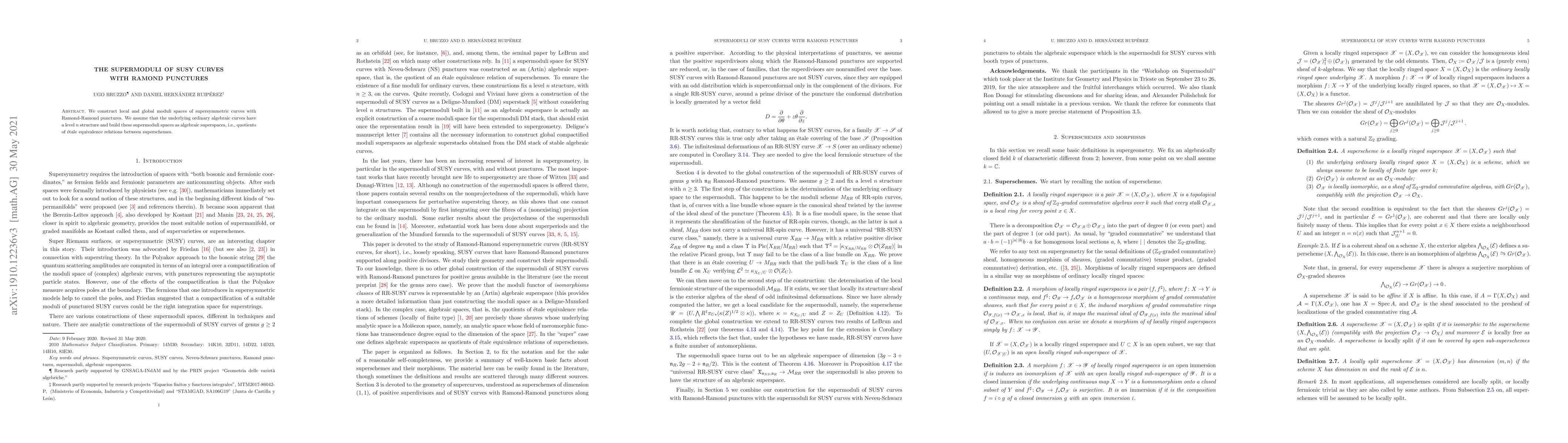 We construct local and global moduli spaces of supersymmetric curves with Ramond-Ramond punctures. We assume that the underlying ordinary algebraic curves have a level n structure and build these supermoduli spaces as algebraic superspaces, i.e., quotients of \'etale equivalence relations between superschemes.