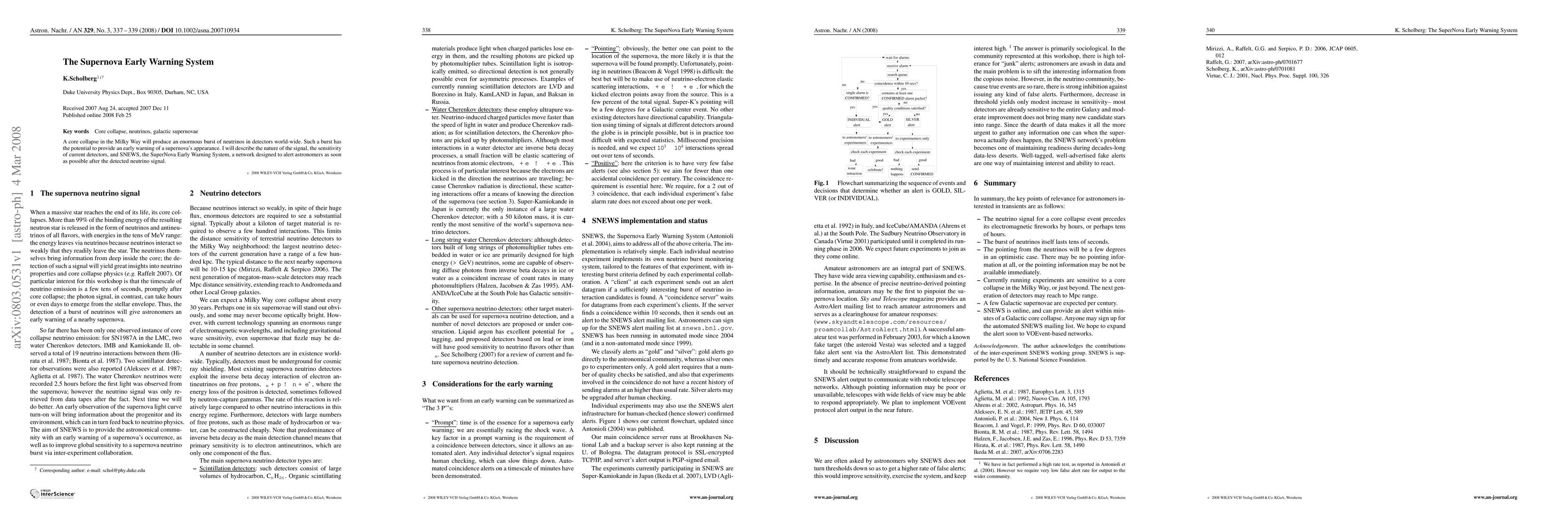 The SuperNova Early Warning System (SNEWS) aims to detect a burst of neutrinos from a core collapse in the Milky Way, providing an early alert for supernovae. This system leverages the sensitivity of current neutrino detectors to identify and notify astronomers promptly after the initial neutrino signal.