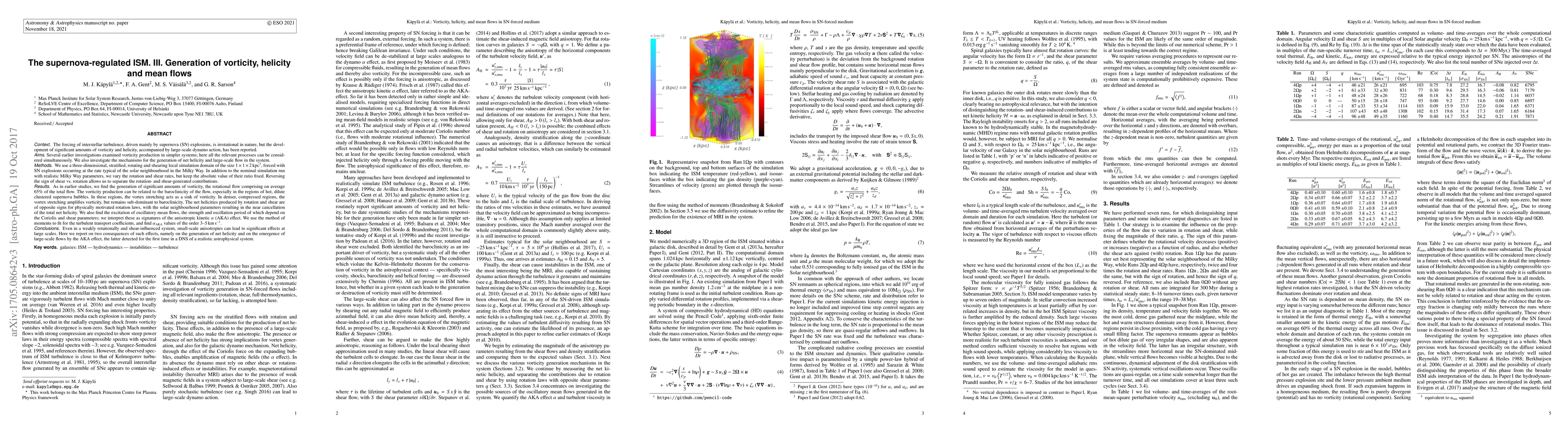 Researchers simulate interstellar turbulence caused by supernova explosions and find significant vorticity and helicity, with 65% of kinetic energy in rotational modes, and excited oscillatory mean flows that depend on Coriolis and shear parameters.