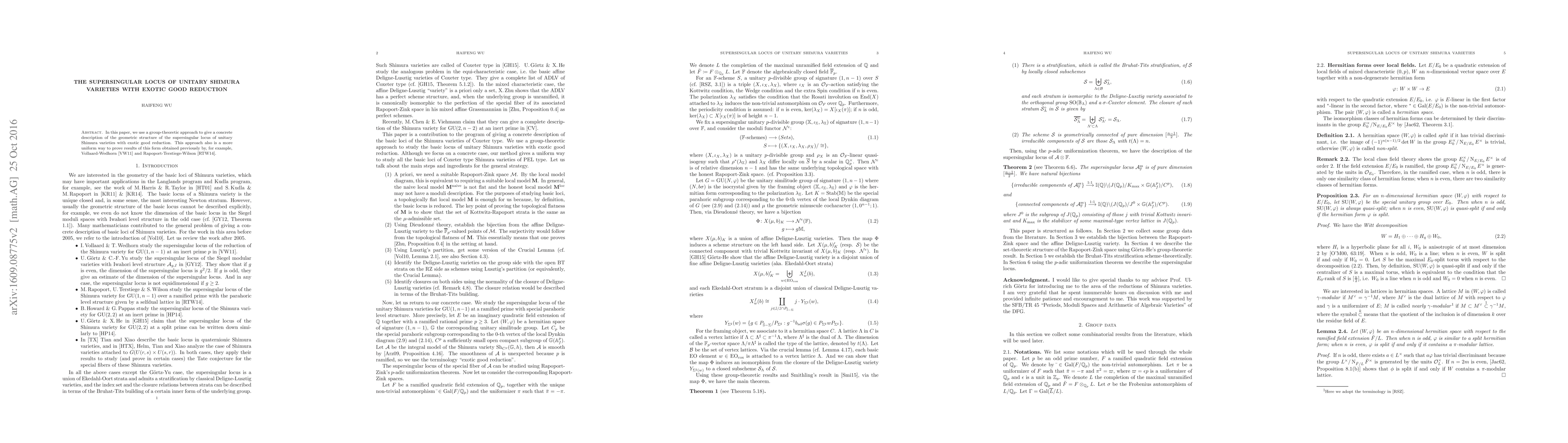 This paper presents a group-theoretic method to describe the supersingular locus of unitary Shimura varieties with exotic good reduction, providing a uniform proof for previous results achieved by Vollaard-Wedhorn and Rapoport-Terstiege-Wilson.