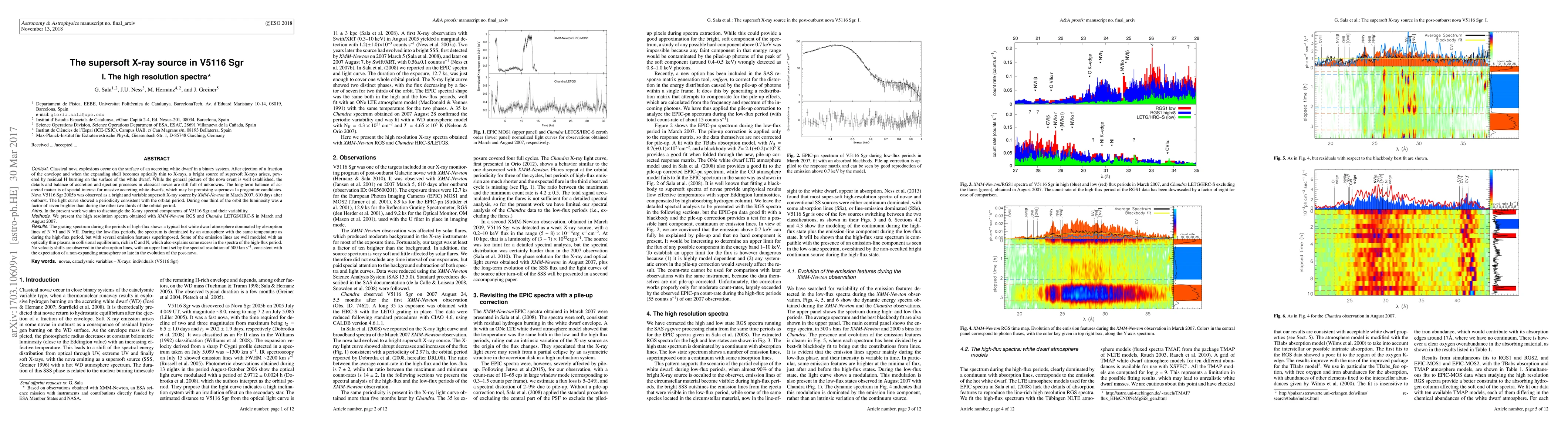 The study analyzes the high-resolution X-ray spectra of the post-nova V5116 Sgr, observed 610 days post-outburst. The spectra, obtained using XMM-Newton and Chandra, reveal a hot white dwarf atmosphere with N VI and N VII absorption lines. During high-luminosity phases, the spectrum shows these absorption lines without shifts, indicating a non-expanding atmosphere. In contrast, low-luminosity phases exhibit additional emission features, modeled as an optically thin plasma rich in C and N. This research sheds light on the accretion-ejection processes in classical novae, potentially informing our understanding of massive white dwarfs as supernova Ia progenitors.