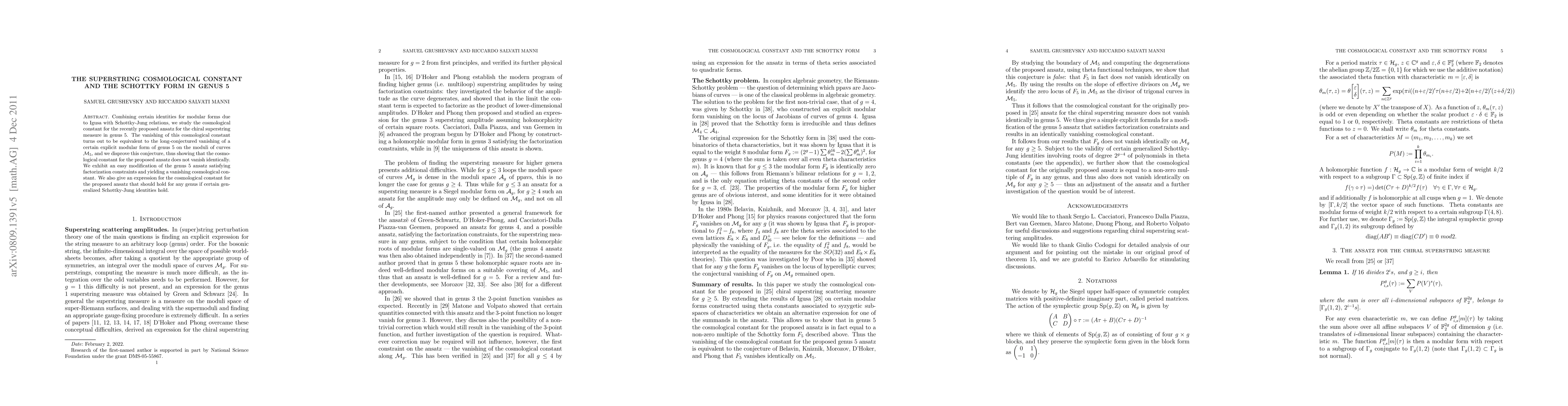 Combining certain identities for modular forms due to Igusa with Schottky-Jung relations, we study the cosmological constant for the recently proposed ansatz for the chiral superstring measure in genus 5. The vanishing of this cosmological constant turns out to be equivalent to the long-conjectured vanishing of a certain explicit modular form of genus 5 on the moduli of curves M_5, and we disprove this conjecture, thus showing that the cosmological constant for the proposed ansatz does not vanish identically. We exhibit an easy modification of the genus 5 ansatz satisfying factorization constraints and yielding a vanishing cosmological constant. We also give an expression for the cosmological constant for the proposed ansatz that should hold for any genus if certain generalized Schottky-Jung identities hold.