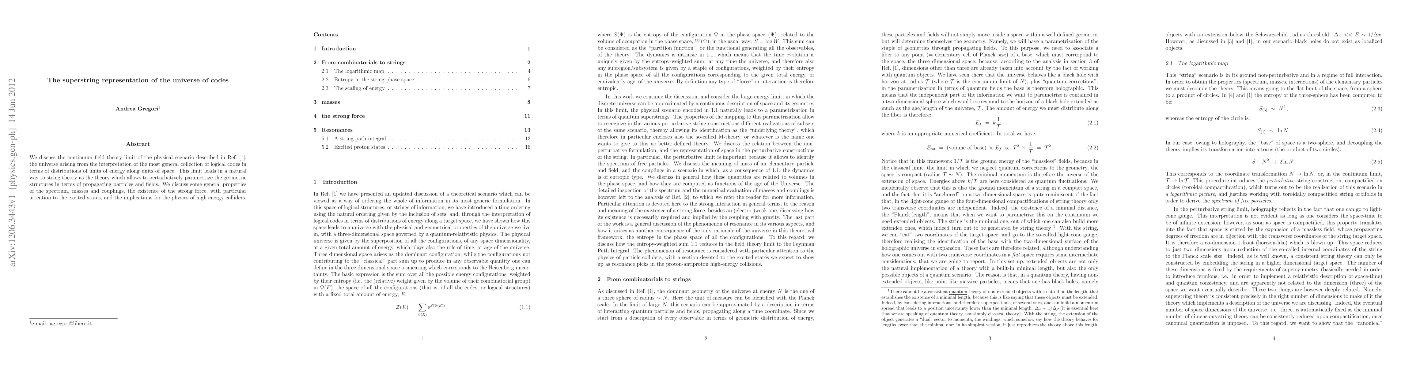 We discuss the continuum field theory limit of the physical scenario described in Ref. [1], the universe arising from the interpretation of the most general collection of logical codes in terms of distributions of units of energy along units of space. This limit leads in a natural way to string theory as the theory which allows to perturbatively parametrize the geometric structures in terms of propagating particles and fields. We discuss some general properties of the spectrum, masses and couplings, the existence of the strong force, with particular attention to the excited states, and the implications for the physics of high energy colliders.