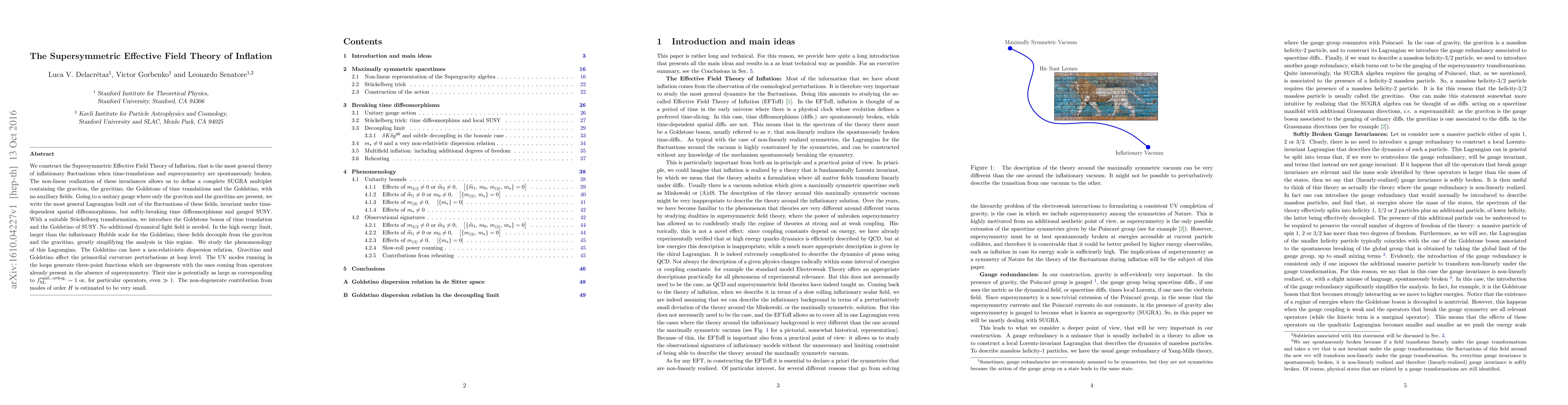 We construct the Supersymmetric Effective Field Theory of Inflation, that is the most general theory of inflationary fluctuations when time-translations and supersymmetry are spontaneously broken. The non-linear realization of these invariances allows us to define a complete SUGRA multiplet containing the graviton, the gravitino, the Goldstone of time translations and the Goldstino, with no auxiliary fields. Going to a unitary gauge where only the graviton and the gravitino are present, we write the most general Lagrangian built out of the fluctuations of these fields, invariant under time-dependent spatial diffeomorphisms, but softly-breaking time diffeomorphisms and gauged SUSY. With a suitable St\"uckelberg transformation, we introduce the Goldstone boson of time translation and the Goldstino of SUSY. No additional dynamical light field is needed. In the high energy limit, larger than the inflationary Hubble scale for the Goldstino, these fields decouple from the graviton and the gravitino, greatly simplifying the analysis in this regime. We study the phenomenology of this Lagrangian. The Goldstino can have a non-relativistic dispersion relation. Gravitino and Goldstino affect the primordial curvature perturbations at loop level. The UV modes running in the loops generate three-point functions which are degenerate with the ones coming from operators already present in the absence of supersymmetry. Their size is potentially as large as corresponding to $f_{\rm NL}^{\rm equil.,\,orthog.}\sim 1$ or, for particular operators, even $\gg 1$. The non-degenerate contribution from modes of order $H$ is estimated to be very small.