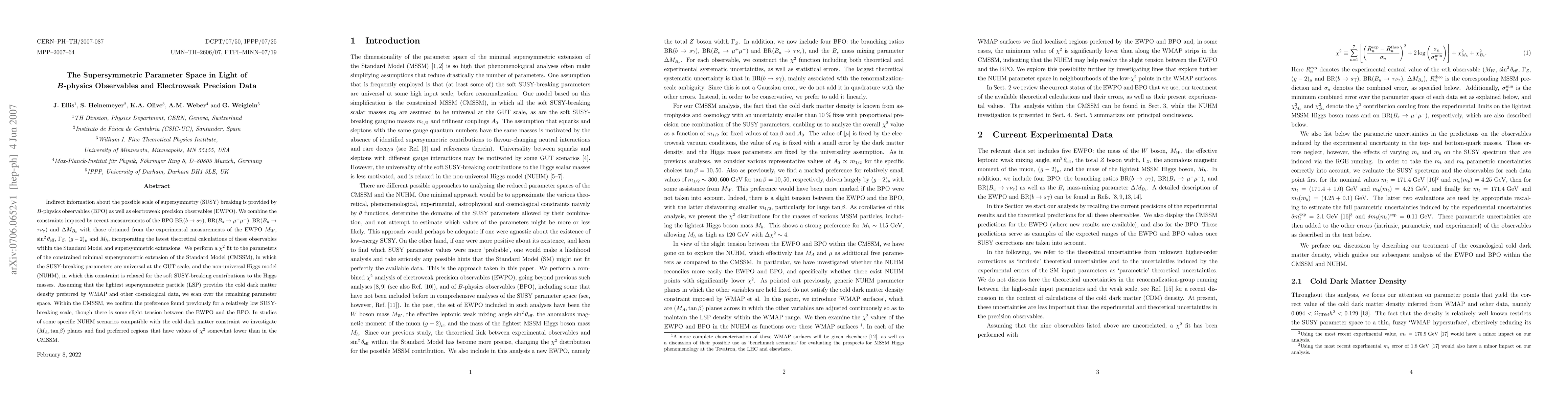 Indirect information about the possible scale of supersymmetry (SUSY) breaking is provided by B-physics observables (BPO) as well as electroweak precision observables (EWPO). We combine the constraints imposed by recent measurements of the BPO BR(b -> s gamma), BR(B_s -> mu^+ mu^-), BR(B_u -> tau nu_tau) and Delta M_{B_s} with those obtained from the experimental measurements of the EWPO M_W, sin^2 theta_eff, Gamma_Z, (g-2)_mu and M_h, incorporating the latest theoretical calculations of these observables within the Standard Model and supersymmetric extensions. We perform a chi^2 fit to the parameters of the constrained minimal supersymmetric extension of the Standard Model (CMSSM), in which the SUSY-breaking parameters are universal at the GUT scale, and the non-universal Higgs model (NUHM), in which this constraint is relaxed for the soft SUSY-breaking contributions to the Higgs masses. Assuming that the lightest supersymmetric particle (LSP) provides the cold dark matter density preferred by WMAP and other cosmological data, we scan over the remaining parameter space. Within the CMSSM, we confirm the preference found previously for a relatively low SUSY-breaking scale, though there is some slight tension between the EWPO and the BPO. In studies of some specific NUHM scenarios compatible with the cold dark matter constraint we investigate M_A-tan_beta planes and find preferred regions that have values of chi^2 somewhat lower than in the CMSSM.