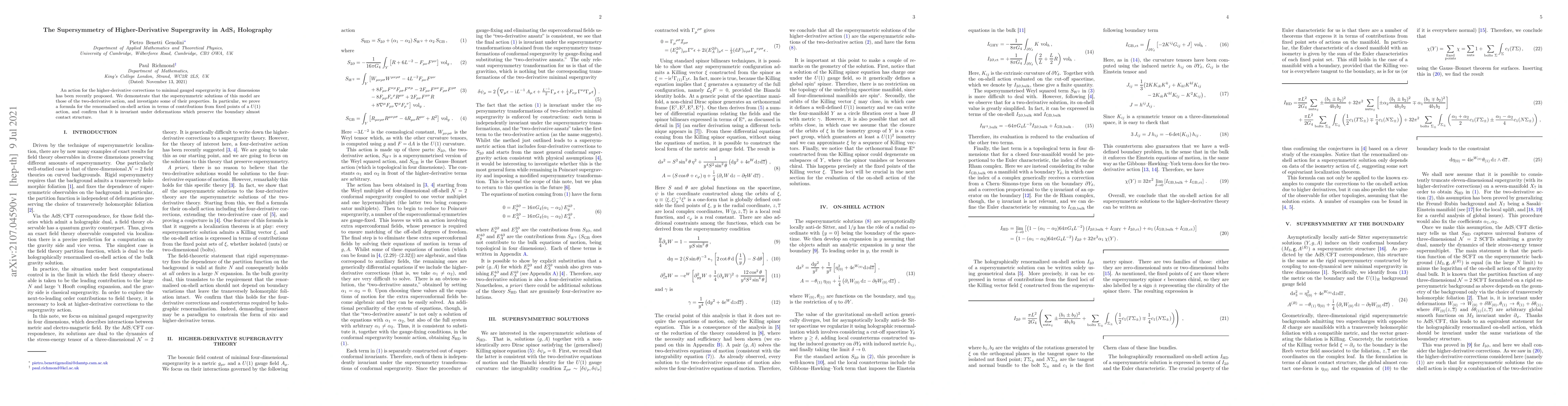 An action for the higher-derivative corrections to minimal gauged supergravity in four dimensions has been recently proposed. We demonstrate that the supersymmetric solutions of this model are those of the two-derivative action, and investigate some of their properties. In particular, we prove a formula for the renormalised on-shell action in terms of contributions from fixed points of a $U(1)$ action, and confirm that it is invariant under deformations which preserve the boundary almost contact structure.