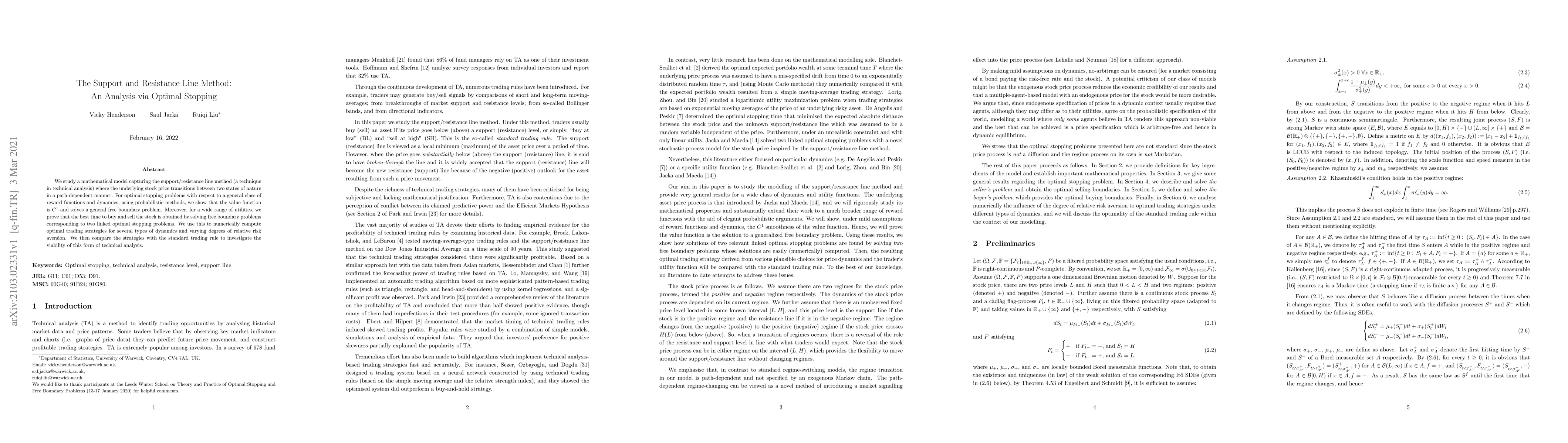 This paper mathematically models the support and resistance line method in technical analysis, demonstrating that the value function is $C^1$ and solves a free boundary problem. It shows that optimal trading strategies can be derived from linked optimal stopping problems, and compares these strategies with standard rules to assess the method's effectiveness.