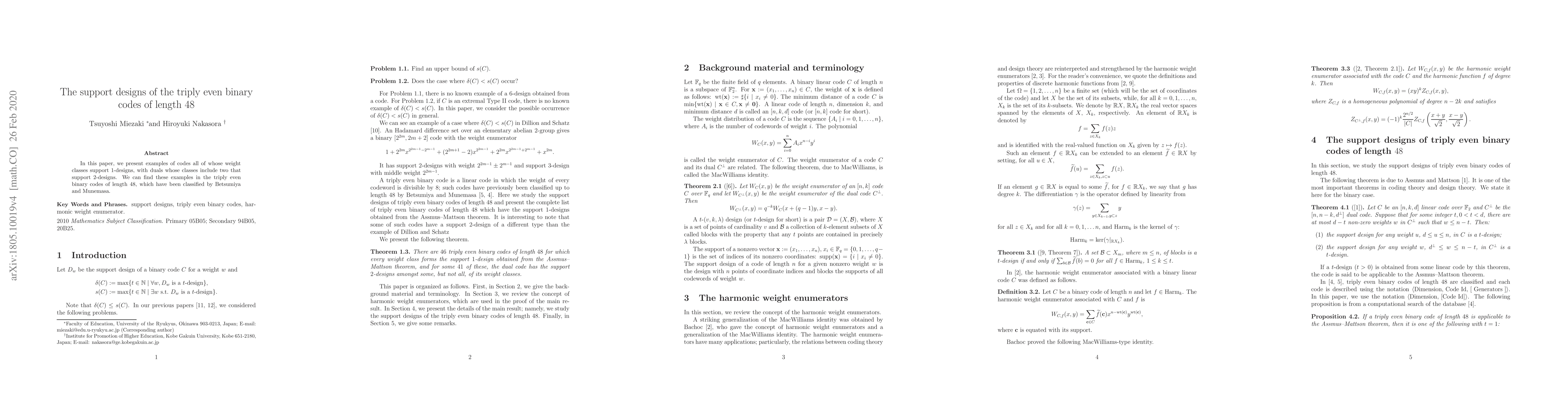 This paper explores triply even binary codes of length 48, showcasing examples where all weight classes support 1-designs, and duals include classes that support 2-designs, as classified by Betsumiya and Munemasa.