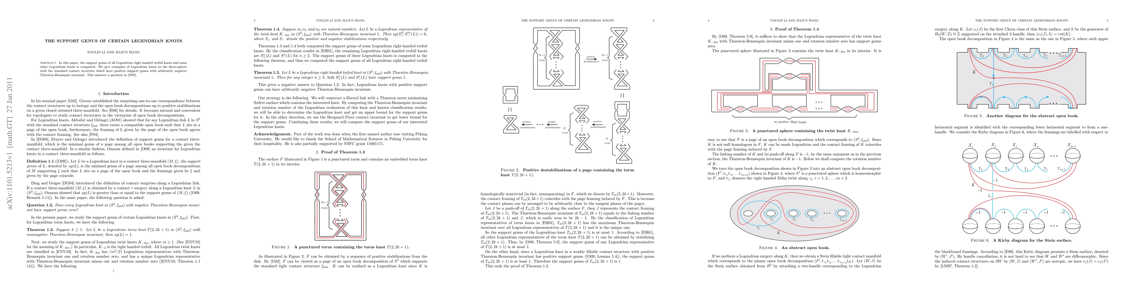 The paper introduces detailed computations and proofs for the support genus of specific Legendrian knots, employing advanced techniques from open book decompositions and stabilization theory.