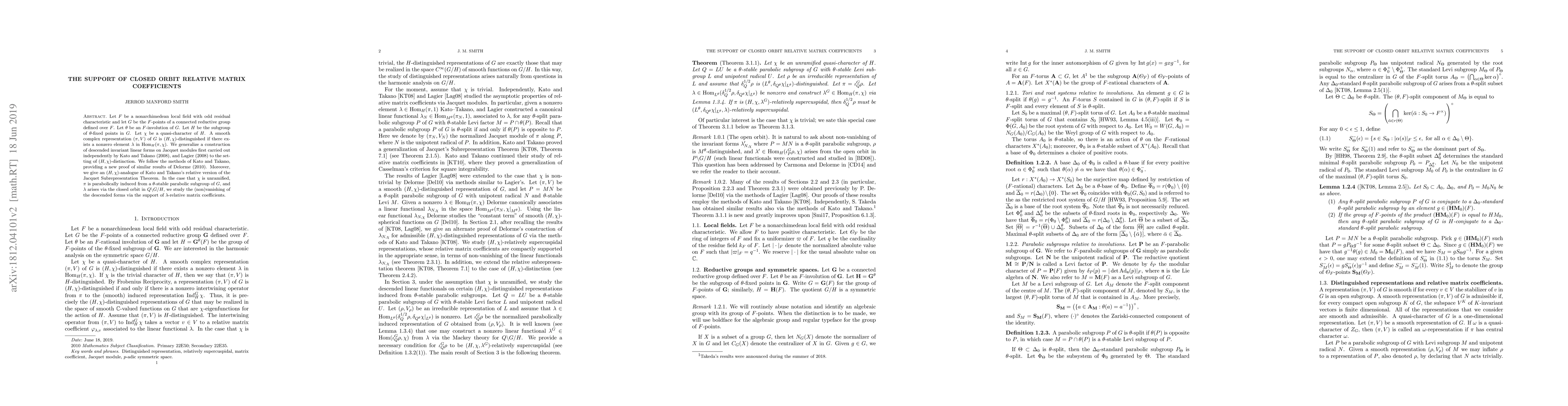 Let $F$ be a nonarchimedean local field with odd residual characteristic and let $G$ be the $F$-points of a connected reductive group defined over $F$. Let $\theta$ be an $F$-involution of $G$. Let $H$ be the subgroup of $\theta$-fixed points in $G$. Let $\chi$ be a quasi-character of $H$. A smooth complex representation $(\pi,V)$ of $G$ is $(H,\chi)$-distinguished if there exists a nonzero element $\lambda$ in $\operatorname{Hom}_H(\pi,\chi)$. We generalize a construction of descended invariant linear forms on Jacquet modules first carried out independently by Kato and Takano (2008), and Lagier (2008) to the setting of $(H,\chi)$-distinction. We follow the methods of Kato and Takano, providing a new proof of similar results of Delorme (2010). Moreover, we give an $(H,\chi)$-analogue of Kato and Takano's relative version of the Jacquet Subrepresentation Theorem. In the case that $\chi$ is unramified, $\pi$ is parabolically induced from a $\theta$-stable parabolic subgroup of $G$, and $\lambda$ arises via the closed orbit in $Q\backslash G / H$, we study the (non)vanishing of the descended forms via the support of $\lambda$-relative matrix coefficients.