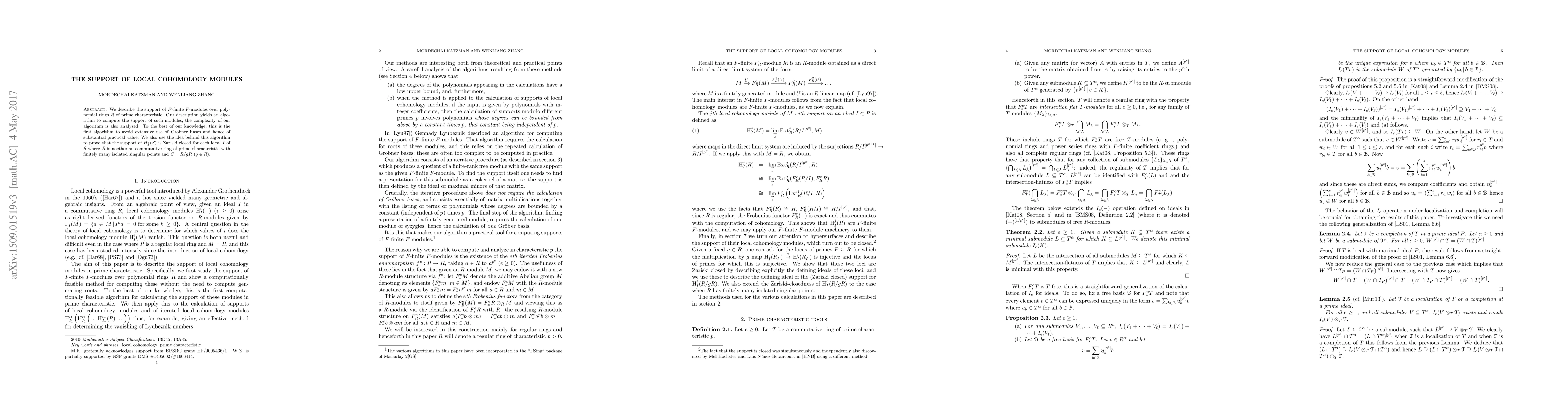 We describe the support of $F$-finite $F$-modules over polynomial rings $R$ of prime characteristic. Our description yields an algorithm to compute the support of such modules; the complexity of our algorithm is also analyzed. To the best of our knowledge, this is the first algorithm to avoid extensive use of Gr\"obner bases and hence of substantial practical value. We also use the idea behind this algorithm to prove that the support of $H^j_I(S)$ is Zariski closed for each ideal $I$ of $S$ where $R$ is noetherian commutative ring of prime characteristic with finitely many isolated singular points and $S=R/gR$ ($g\in R$).
