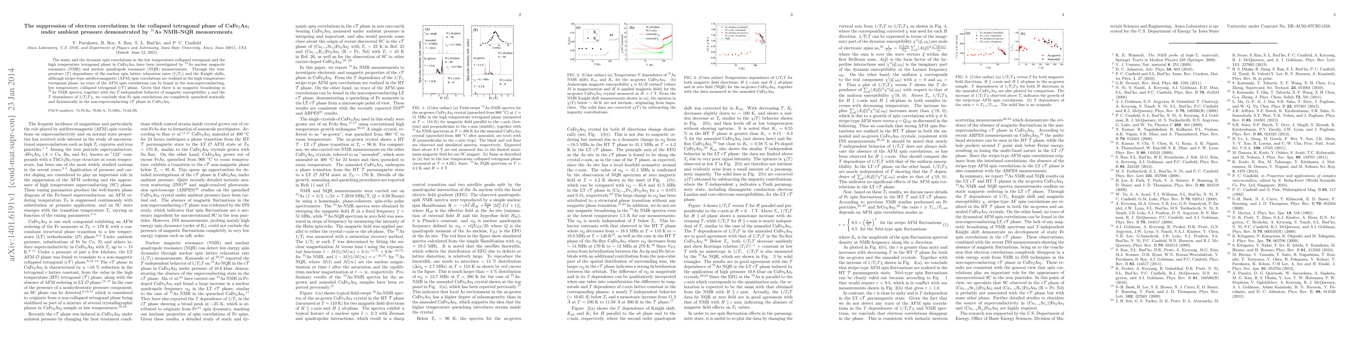 This study utilizes 75As NMR-NQR to investigate spin correlations in CaFe2As2, revealing that while high-temperature tetragonal phase exhibits stripe-type AFM spin correlations, the collapsed tetragonal phase shows no AFM spin correlations, indicating complete suppression of Fe spin correlations both statically and dynamically.