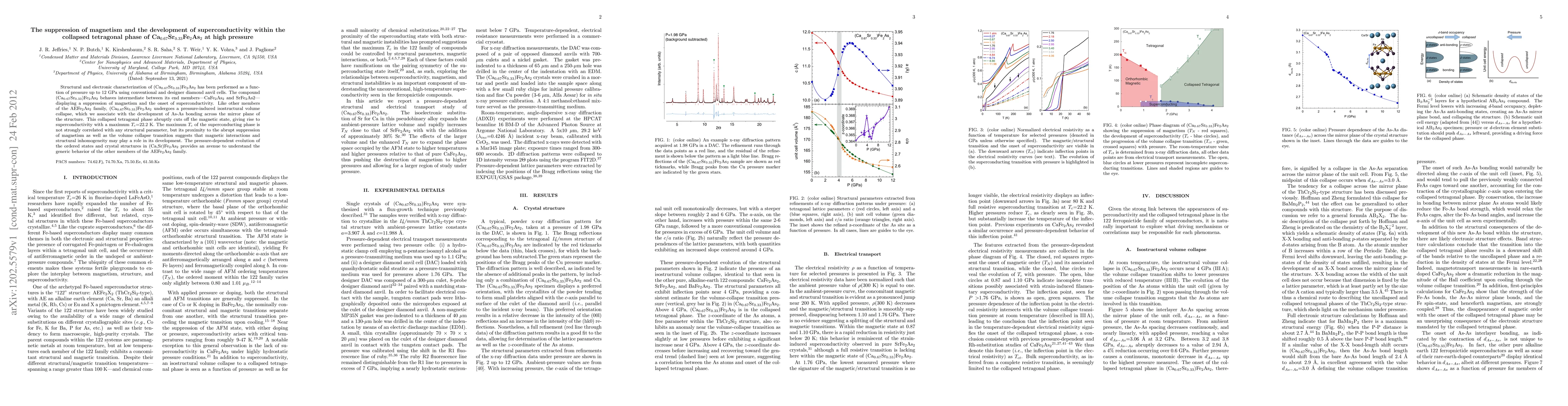 Structural and electronic characterization of (Ca0.67Sr0.33)Fe2As2 has been performed as a func- tion of pressure up to 12 GPa using conventional and designer diamond anvil cells. The compound (Ca0.67Sr0.33)Fe2As2 behaves intermediate between its end members-CaFe2As2 and SrFe2As2- displaying a suppression of magnetism and the onset of superconductivity. Like other members of the AEFe2As2 family, (Ca0.67Sr0.33)Fe2As2 undergoes a pressure-induced isostructural volume collapse, which we associate with the development of As-As bonding across the mirror plane of the structure. This collapsed tetragonal phase abruptly cuts off the magnetic state, giving rise to superconductivity with a maximum Tc=22.2 K. The maximum Tc of the superconducting phase is not strongly correlated with any structural parameter, but its proximity to the abrupt suppression of magnetism as well as the volume collapse transition suggests that magnetic interactions and structural inhomogeneity may play a role in its development. The pressure-dependent evolution of the ordered states and crystal structures in (Ca,Sr)Fe2As2 provides an avenue to understand the generic behavior of the other members of the AEFe2As2 family.