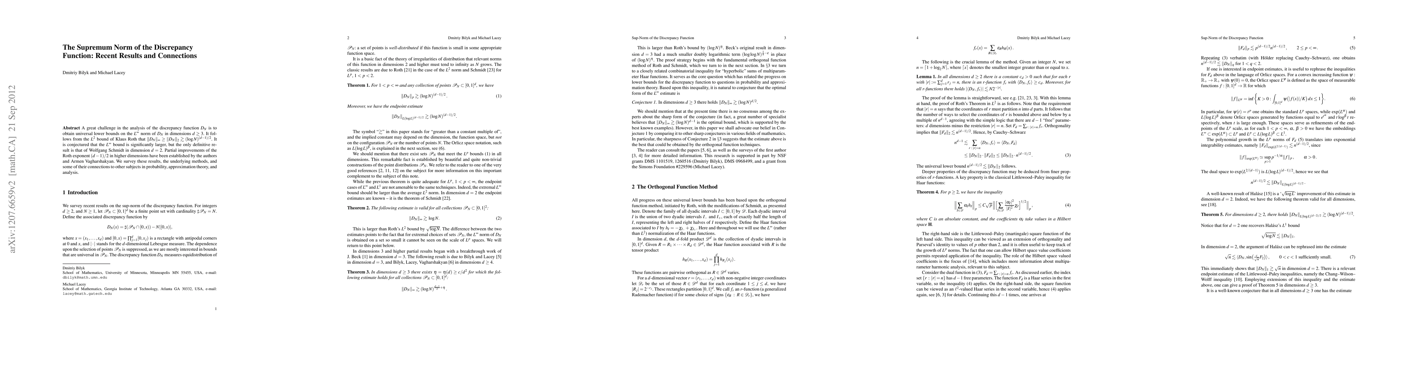 A great challenge in the analysis of the discrepancy function D_N is to obtain universal lower bounds on the L-infty norm of D_N in dimensions d \geq 3. It follows from the average case bound of Klaus Roth that the L-infty norm of D_N is at least (log N) ^{(d-1)/2}. It is conjectured that the L-infty bound is significantly larger, but the only definitive result is that of Wolfgang Schmidt in dimension d=2. Partial improvements of the Roth exponent (d-1)/2 in higher dimensions have been established by the authors and Armen Vagharshakyan. We survey these results, the underlying methods, and some of their connections to other subjects in probability, approximation theory, and analysis.