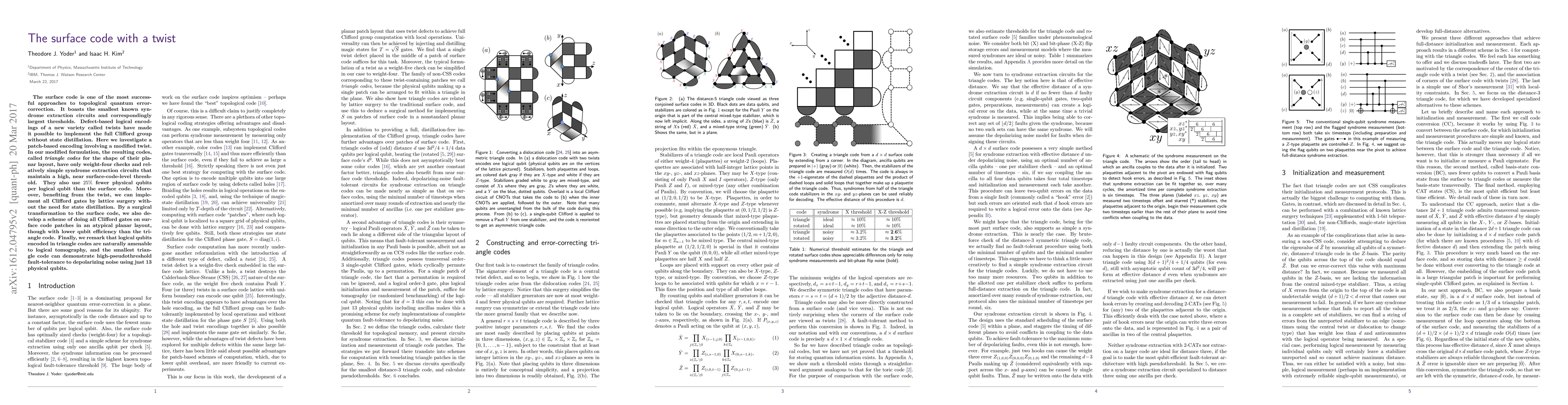 The surface code is one of the most successful approaches to topological quantum error-correction. It boasts the smallest known syndrome extraction circuits and correspondingly largest thresholds. Defect-based logical encodings of a new variety called twists have made it possible to implement the full Clifford group without state distillation. Here we investigate a patch-based encoding involving a modified twist. In our modified formulation, the resulting codes, called triangle codes for the shape of their planar layout, have only weight-four checks and relatively simple syndrome extraction circuits that maintain a high, near surface-code-level threshold. They also use 25% fewer physical qubits per logical qubit than the surface code. Moreover, benefiting from the twist, we can implement all Clifford gates by lattice surgery without the need for state distillation. By a surgical transformation to the surface code, we also develop a scheme of doing all Clifford gates on surface code patches in an atypical planar layout, though with less qubit efficiency than the triangle code. Finally, we remark that logical qubits encoded in triangle codes are naturally amenable to logical tomography, and the smallest triangle code can demonstrate high-pseudothreshold fault-tolerance to depolarizing noise using just 13 physical qubits.