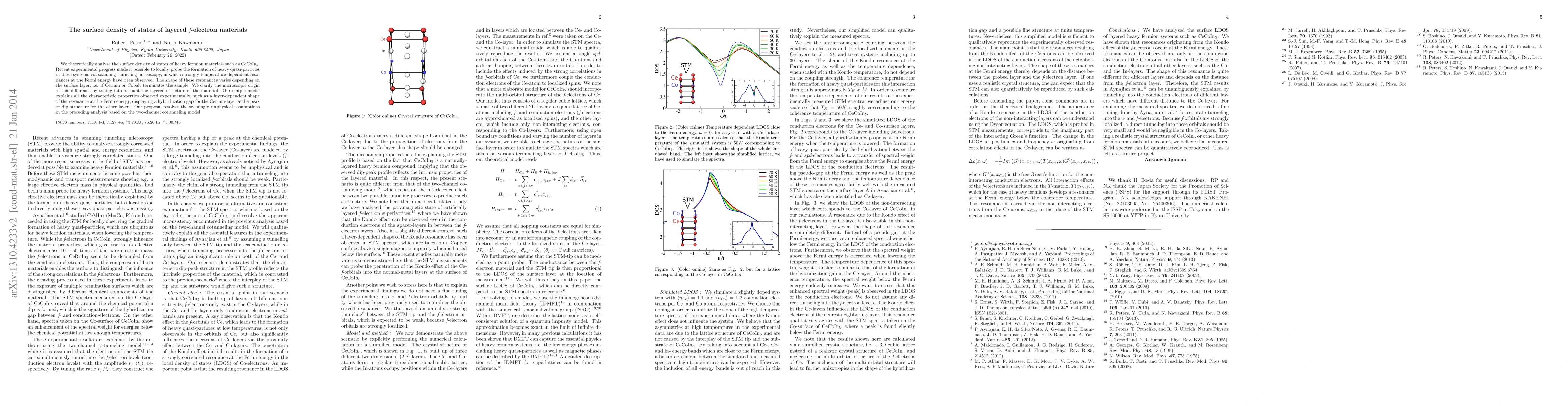 We theoretically analyze the surface density of states of heavy fermion materials such as CeCoIn$_5$. Recent experimental progress made it possible to locally probe the formation of heavy quasi-particles in these systems via scanning tunneling microscopy, in which strongly temperature-dependent resonances at the Fermi energy have been observed. The shape of these resonances varies depending on the surface layer, i.e. if Cerium or Cobalt terminates the sample. We clarify the microscopic origin of this difference by taking into account the layered structure of the material. Our simple model explains all the characteristic properties observed experimentally, such as a layer-dependent shape of the resonance at the Fermi energy, displaying a hybridization gap for the Cerium-layer and a peak or dip structure for the other layers. Our proposal resolves the seemingly unphysical assumptions in the preceding analysis based on the two-channel cotunneling model.