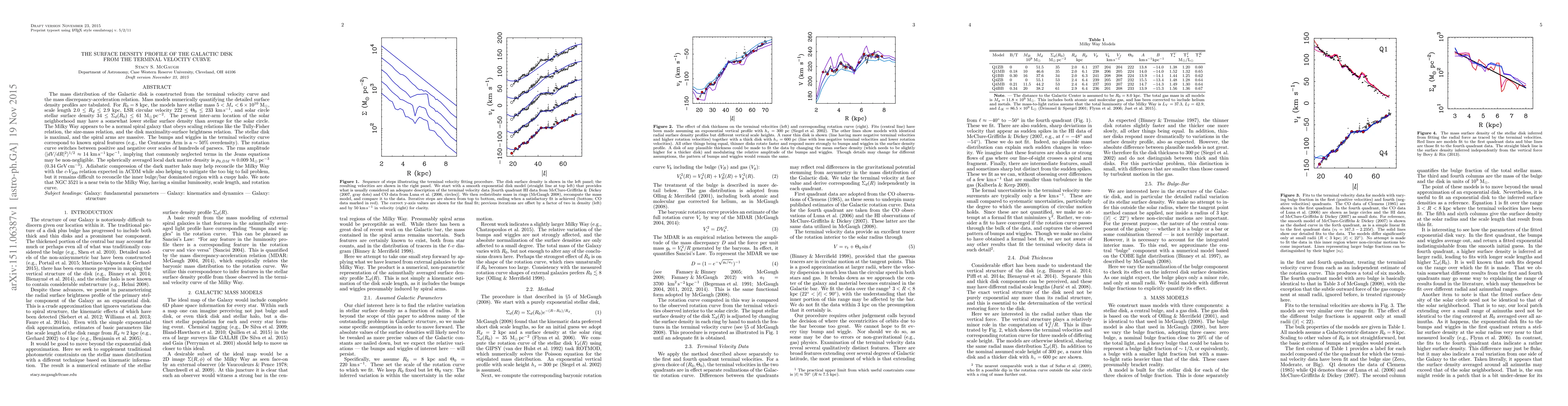 The mass distribution of the Galactic disk is constructed from the terminal velocity curve and the mass discrepancy-acceleration relation. Mass models numerically quantifying the detailed surface density profiles are tabulated. For $R_0 = 8$ kpc, the models have stellar mass $5 < M_* < 6 \times 10^{10}$ M$_{\odot}$, scale length $2.0 \le R_d \le 2.9$ kpc, LSR circular velocity $222 \le \Theta_0 \le 233$ km s$^{-1}$, and solar circle stellar surface density $34 \le \Sigma_d(R_0) \le 61$ M$_{\odot}$ pc$^{-2}$. The present inter-arm location of the solar neighborhood may have a somewhat lower stellar surface density than average for the solar circle. The Milky Way appears to be a normal spiral galaxy that obeys scaling relations like the Tully-Fisher relation, the size-mass relation, and the disk maximality-surface brightness relation. The stellar disk is maximal, and the spiral arms are massive. The bumps and wiggles in the terminal velocity curve correspond to known spiral features (e.g., the Centaurus Arm is a $\sim 50\%$ overdensity). The rotation curve switches between positive and negative over scales of hundreds of parsecs. The rms amplitude $\langle$$|$$dV/dR$$|^2$$\rangle$$^{1/2} \approx 14$ km s$^{-1}$ kpc$^{-1}$, implying that commonly neglected terms in the Jeans equations may be non-negligible. The spherically averaged local dark matter density is $\rho_{0,DM} \approx 0.009$ M$_{\odot}$ pc$^{-3}$ (0.3 GeV cm$^{-3}$). Adiabatic compression of the dark matter halo may help reconcile the Milky Way with the $c$-$V_{200}$ relation expected in $\Lambda$CDM while also helping to mitigate the too big to fail problem, but it remains difficult to reconcile the inner bulge/bar dominated region with a cuspy halo. We note that NGC 3521 is a near twin to the Milky Way, having a similar luminosity, scale length, and rotation curve.