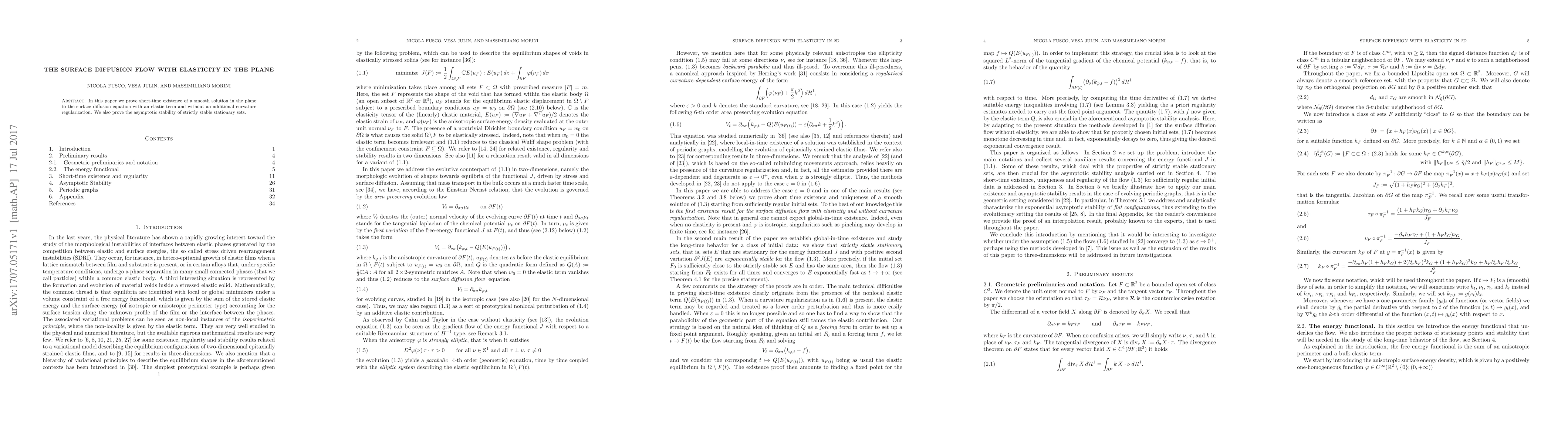 In this paper we prove short-time existence of a smooth solution in the plane to the surface diffusion equation with an elastic term and without an additional curvature regularization. We also prove the asymptotic stability of strictly stable stationary sets.