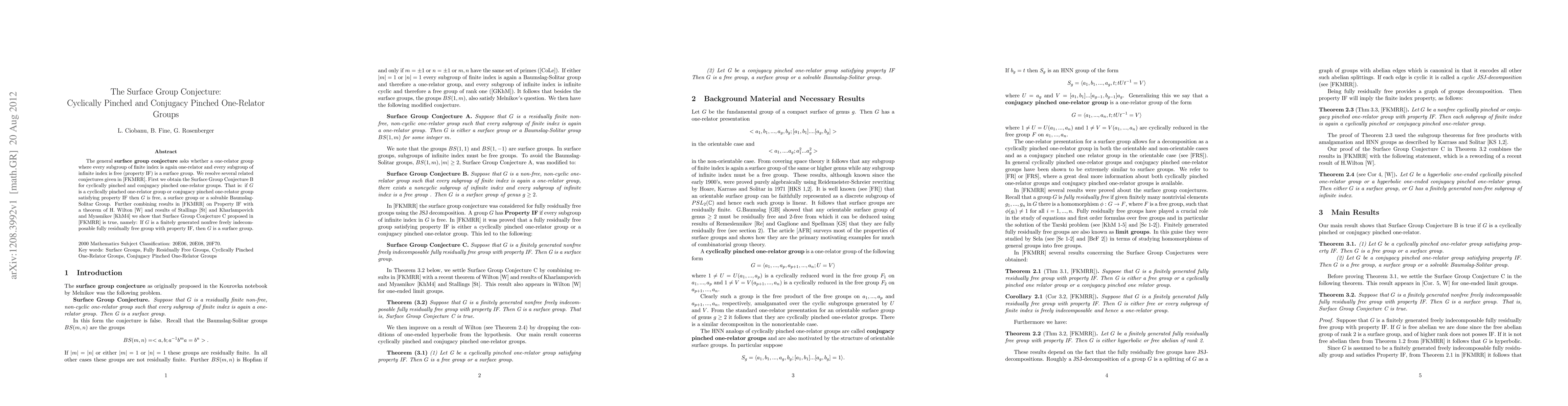 The general {\bf surface group conjecture} asks whether a one-relator group where every subgroup of finite index is again one-relator and every subgroup of infinite index is free (property IF) is a surface group. We resolve several related conjectures given in [FKMRR]. First we obtain the Surface Group Conjecture B for cyclically pinched and conjugacy pinched one-relator groups. That is: if $G$ is a cyclically pinched one-relator group or conjugacy pinched one-relator group satisfying property IF then $G$ is free, a surface group or a solvable Baumslag-Solitar Group. Further combining results in [FKMRR] on Property IF with a theorem of H. Wilton [W] and results of Stallings [St] and Kharlampovich and Myasnikov [KhM4] we show that Surface Group Conjecture C proposed in [FKMRR] is true, namely: If $G$ is a finitely generated nonfree freely indecomposable fully residually free group with property IF, then $G$ is a surface group.