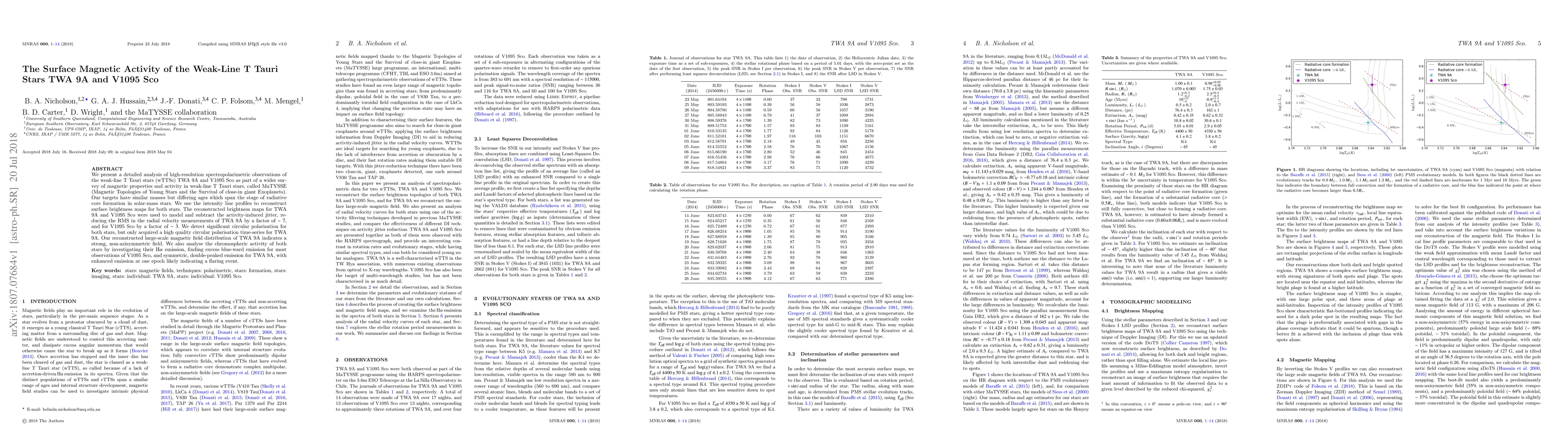 We present a detailed analysis of high-resolution spectropolarimetric observations of the weak-line T Tauri stars (wTTSs) TWA 9A and V1095 Sco as part of a wider sur- vey of magnetic properties and activity in weak-line T Tauri stars, called MaTYSSE (Magnetic Topologies of Young Stars and the Survival of close-in giant Exoplanets). Our targets have similar masses but differing ages which span the stage of radiative core formation in solar-mass stars. We use the intensity line profiles to reconstruct surface brightness maps for both stars. The reconstructed brightness maps for TWA 9A and V1095 Sco were used to model and subtract the activity-induced jitter, reducing the RMS in the radial velocity measurements of TWA 9A by a factor of $\sim$7, and for V1095 Sco by a factor of $\sim$3. We detect significant circular polarisation for both stars, but only acquired a high quality circular polarisation time-series for TWA 9A. Our reconstructed large-scale magnetic field distribution of TWA 9A indicates a strong, non-axisymmetric field. We also analyse the chromospheric activity of both stars by investigating their H$\alpha$ emission, finding excess blue-ward emission for most observations of V1095 Sco, and symmetric, double-peaked emission for TWA 9A, with enhanced emission at one epoch likely indicating a flaring event.