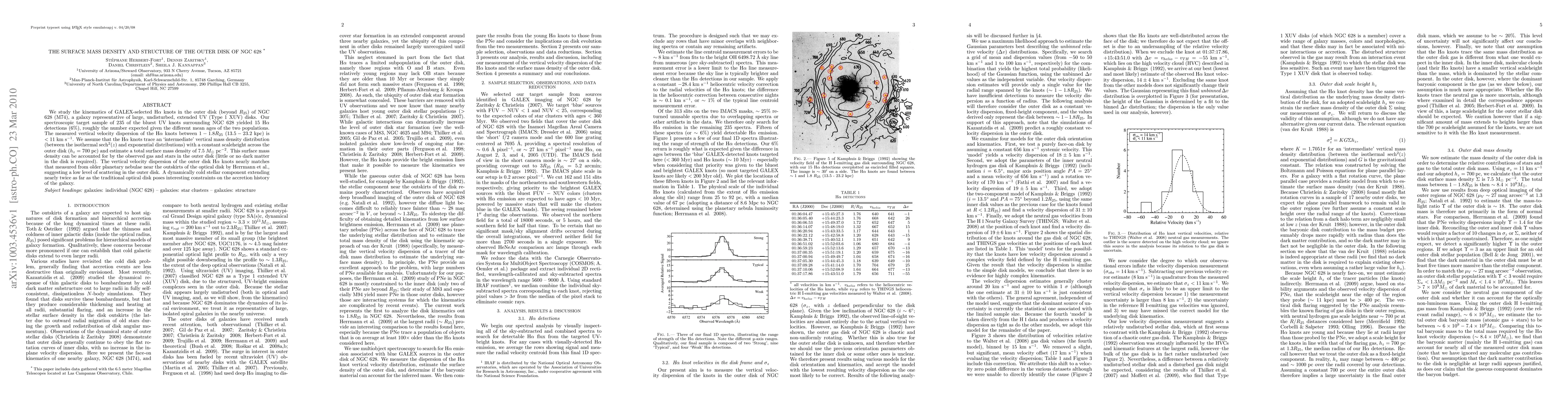 We study the kinematics of GALEX-selected H_alpha knots in the outer disk (beyond R25) of NGC 628 (M74), a galaxy representative of large, undisturbed, extended UV (Type 1 XUV) disks. Our spectroscopic target sample of 235 of the bluest UV knots surrounding NGC 628 yielded 15 H_alpha detections (6%), roughly the number expected given the different mean ages of the two populations. The measured vertical velocity dispersion of the H_alpha knots between 1 - 1.8 R25 (13.5 - 23.2 kpc) is < 11 km/s. We assume that the H_alpha knots trace an 'intermediate' vertical mass density distribution (between the isothermal sech(z)^2 and exponential distributions) with a constant scaleheight across the outer disk (h_z = 700 pc) and estimate a total surface mass density of 7.5 solar masses/pc^2. This surface mass density can be accounted for by the observed gas and stars in the outer disk (little or no dark matter in the disk is required). The vertical velocity dispersion of the outer disk H_alpha knots nearly matches that measured from older planetary nebulae near the outskirts of the optical disk by Herrmann et al., suggesting a low level of scattering in the outer disk. A dynamically cold stellar component extending nearly twice as far as the traditional optical disk poses interesting constraints on the accretion history of the galaxy.
