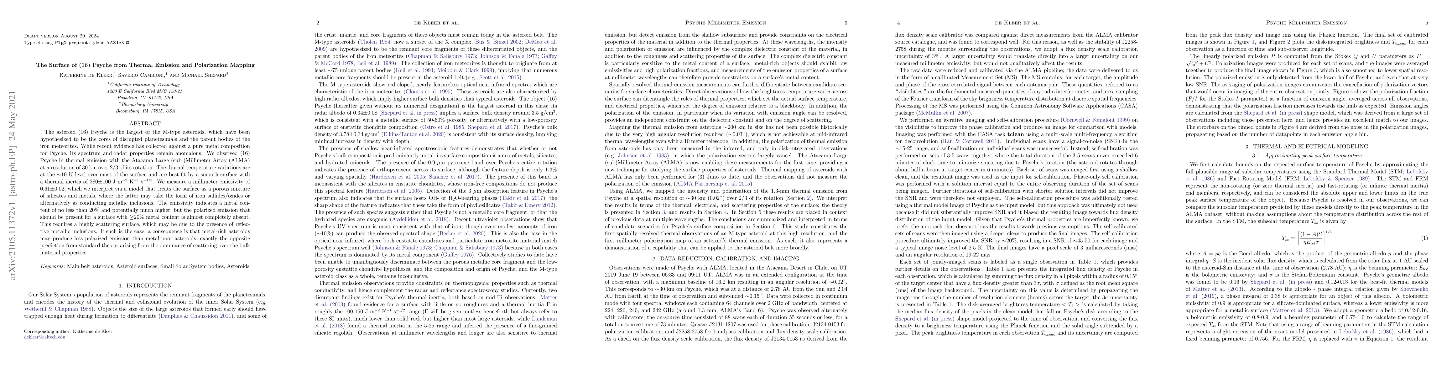 The asteroid (16) Psyche is the largest of the M-type asteroids, which have been hypothesized to be the cores of disrupted planetesimals and the parent bodies of the iron meteorites. While recent evidence has collected against a pure metal composition for Psyche, its spectrum and radar properties remain anomalous. We observed (16) Psyche in thermal emission with the Atacama Large (sub-)Millimeter Array (ALMA) at a resolution of 30 km over 2/3 of its rotation. The diurnal temperature variations are at the $\sim$10 K level over most of the surface and are best fit by a smooth surface with a thermal inertia of 280$\pm$100 J m$^{-2}$ K$^{-1}$ s$^{-1/2}$. We measure a millimeter emissivity of 0.61$\pm$0.02, which we interpret via a model that treats the surface as a porous mixture of silicates and metals, where the latter may take the form of iron sulfides/oxides or alternatively as conducting metallic inclusions. The emissivity indicates a metal content of no less than 20\% and potentially much higher, but the polarized emission that should be present for a surface with $\geq$20\% metal content is almost completely absent. This requires a highly scattering surface, which may be due to the presence of reflective metallic inclusions. If such is the case, a consequence is that metal-rich asteroids may produce less polarized emission than metal-poor asteroids, exactly the opposite prediction from standard theory, arising from the dominance of scattering over the bulk material properties.