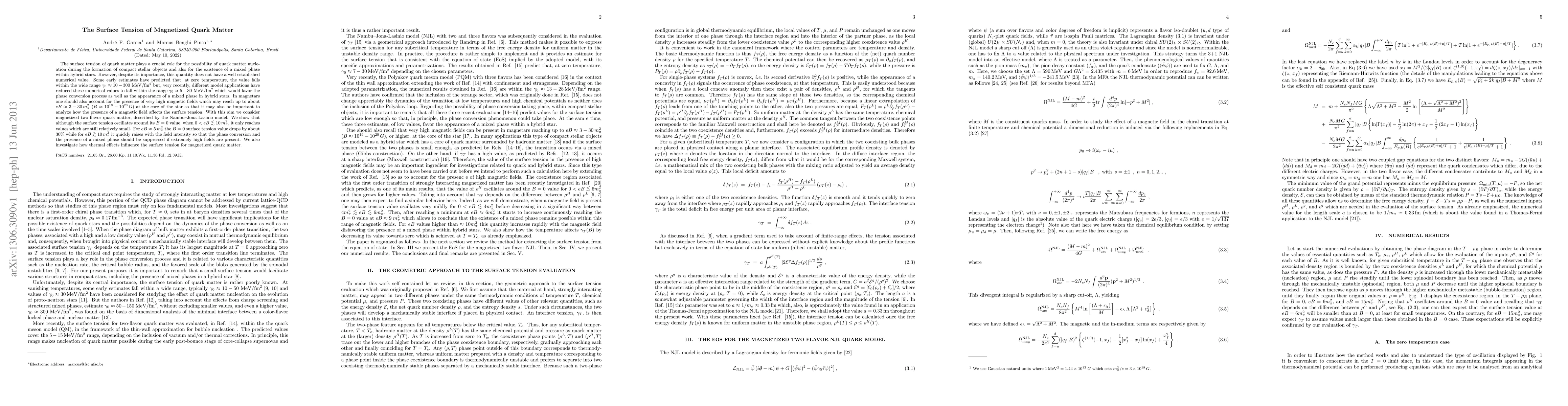 The surface tension of quark matter plays a crucial role for the possibility of quark matter nucleation during the formation of compact stellar objects and also for the existence of a mixed phase within hybrid stars. However, despite its importance, this quantity does not have a well established numerical value. Some early estimates have predicted that, at zero temperature, the value falls within the wide range $\gamma_0\approx10-300{\rm\ MeV/fm^2}$ but, very recently, different model applications have reduced these numerical values to fall within the range $\gamma_0\approx5-30{\rm\ MeV/fm^2}$ which would favor the phase conversion process as well as the appearance of a mixed phase in hybrid stars. In magnetars one should also account for the presence of very high magnetic fields which may reach up to about $ eB\approx 3-30\, m_\pi^2$ ($B \approx 10^{19}-10^{20} \,G$) at the core of the star so that it may also be important to analyze how the presence of a magnetic field affects the surface tension. With this aim we consider magnetized two flavor quark matter, described by the Nambu--Jona-Lasinio model. We show that although the surface tension oscillates around its B=0 value, when $0 < eB \lesssim 10 \, m_\pi^2$, it only reaches values which are still relatively small. For $eB \approx 5\, m_\pi^2$ the B=0 surface tension value drops by about 30% while for $eB \gtrsim 10\, m_\pi^2$ it quickly raises with the field intensity so that the phase conversion and the presence of a mixed phase should be suppressed if extremely high fields are present. We also investigate how thermal effects influence the surface tension for magnetized quark matter.