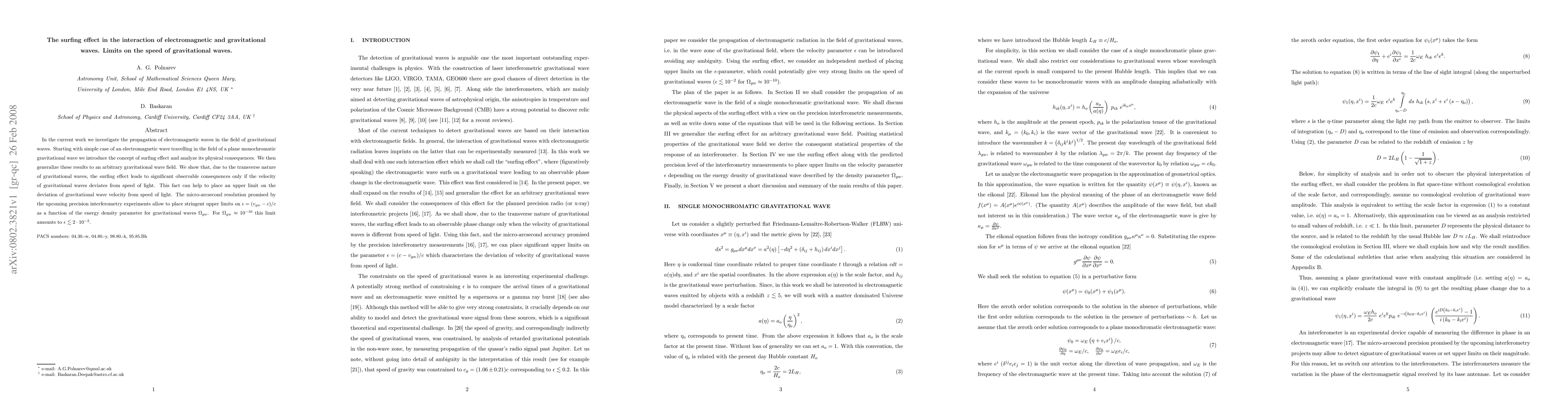 In the current work we investigate the propagation of electromagnetic waves in the field of gravitational waves. Starting with simple case of an electromagnetic wave travelling in the field of a plane monochromatic gravitational wave we introduce the concept of surfing effect and analyze its physical consequences. We then generalize these results to an arbitrary gravitational wave field. We show that, due to the transverse nature of gravitational waves, the surfing effect leads to significant observable consequences only if the velocity of gravitational waves deviates from speed of light. This fact can help to place an upper limit on the deviation of gravitational wave velocity from speed of light. The micro-arcsecond resolution promised by the upcoming precision interferometry experiments allow to place stringent upper limits on $\epsilon = (v_{gw}-c)/c$ as a function of the energy density parameter for gravitational waves $\Omega_{gw}$. For $\Omega_{gw} \approx 10^{-10}$ this limit amounts to $\epsilon\lesssim 2\cdot 10^{-2}$.