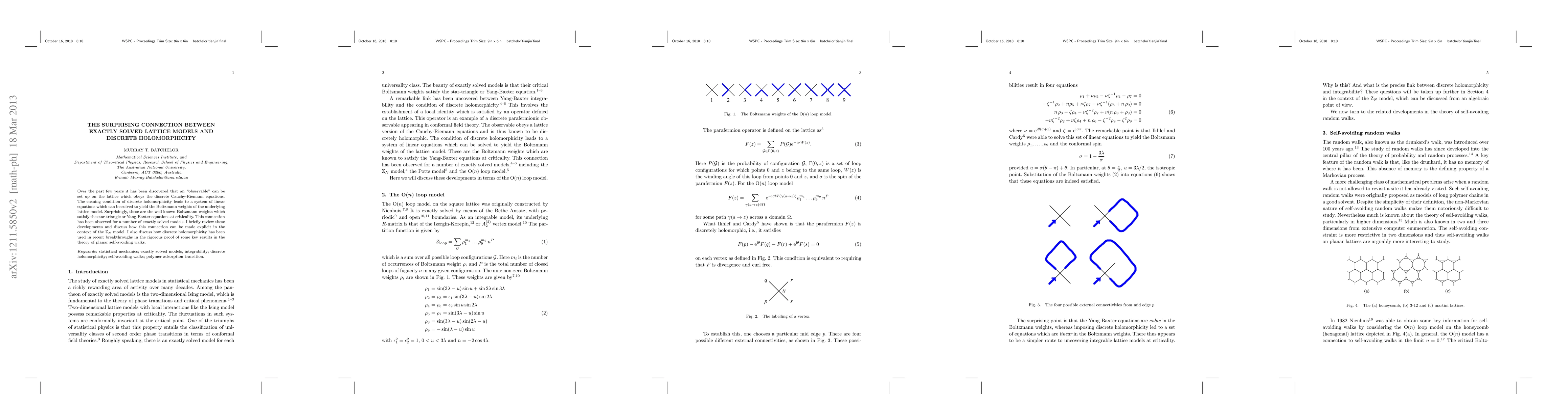 This paper explores the surprising link between exactly solved lattice models and discrete holomorphicity, revealing that a lattice-based "observable" satisfying the discrete Cauchy-Riemann equations can determine the Boltzmann weights of the model, which are known to satisfy star-triangle or Yang-Baxter equations. The findings are exemplified in the Z_N model and have contributed to breakthroughs in proving results for planar self-avoiding walks.