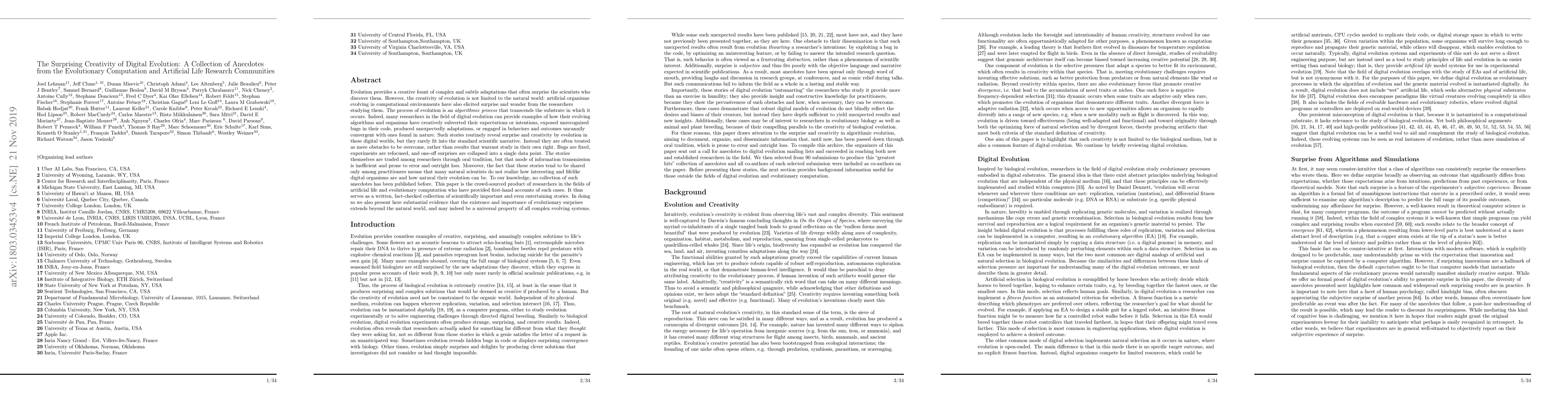 Biological evolution provides a creative fount of complex and subtle adaptations, often surprising the scientists who discover them. However, because evolution is an algorithmic process that transcends the substrate in which it occurs, evolution's creativity is not limited to nature. Indeed, many researchers in the field of digital evolution have observed their evolving algorithms and organisms subverting their intentions, exposing unrecognized bugs in their code, producing unexpected adaptations, or exhibiting outcomes uncannily convergent with ones in nature. Such stories routinely reveal creativity by evolution in these digital worlds, but they rarely fit into the standard scientific narrative. Instead they are often treated as mere obstacles to be overcome, rather than results that warrant study in their own right. The stories themselves are traded among researchers through oral tradition, but that mode of information transmission is inefficient and prone to error and outright loss. Moreover, the fact that these stories tend to be shared only among practitioners means that many natural scientists do not realize how interesting and lifelike digital organisms are and how natural their evolution can be. To our knowledge, no collection of such anecdotes has been published before. This paper is the crowd-sourced product of researchers in the fields of artificial life and evolutionary computation who have provided first-hand accounts of such cases. It thus serves as a written, fact-checked collection of scientifically important and even entertaining stories. In doing so we also present here substantial evidence that the existence and importance of evolutionary surprises extends beyond the natural world, and may indeed be a universal property of all complex evolving systems.