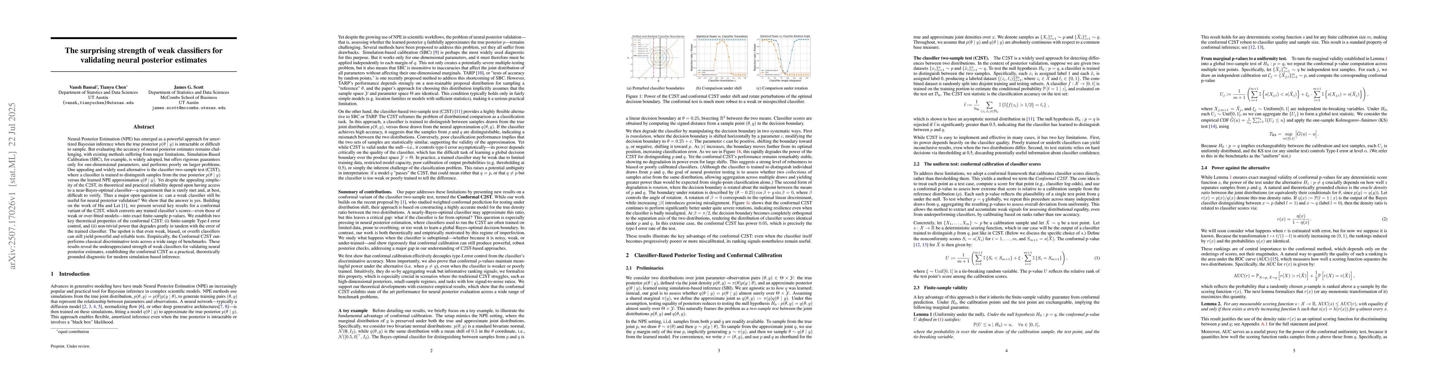 Neural Posterior Estimation (NPE) has emerged as a powerful approach for amortized Bayesian inference when the true posterior $p(\theta \mid y)$ is intractable or difficult to sample. But evaluating the accuracy of neural posterior estimates remains challenging, with existing methods suffering from major limitations. One appealing and widely used method is the classifier two-sample test (C2ST), where a classifier is trained to distinguish samples from the true posterior $p(\theta \mid y)$ versus the learned NPE approximation $q(\theta \mid y)$. Yet despite the appealing simplicity of the C2ST, its theoretical and practical reliability depend upon having access to a near-Bayes-optimal classifier -- a requirement that is rarely met and, at best, difficult to verify. Thus a major open question is: can a weak classifier still be useful for neural posterior validation? We show that the answer is yes. Building on the work of Hu and Lei, we present several key results for a conformal variant of the C2ST, which converts any trained classifier's scores -- even those of weak or over-fitted models -- into exact finite-sample p-values. We establish two key theoretical properties of the conformal C2ST: (i) finite-sample Type-I error control, and (ii) non-trivial power that degrades gently in tandem with the error of the trained classifier. The upshot is that even weak, biased, or overfit classifiers can still yield powerful and reliable tests. Empirically, the Conformal C2ST outperforms classical discriminative tests across a wide range of benchmarks. These results reveal the under appreciated strength of weak classifiers for validating neural posterior estimates, establishing the conformal C2ST as a practical, theoretically grounded diagnostic for modern simulation-based inference.