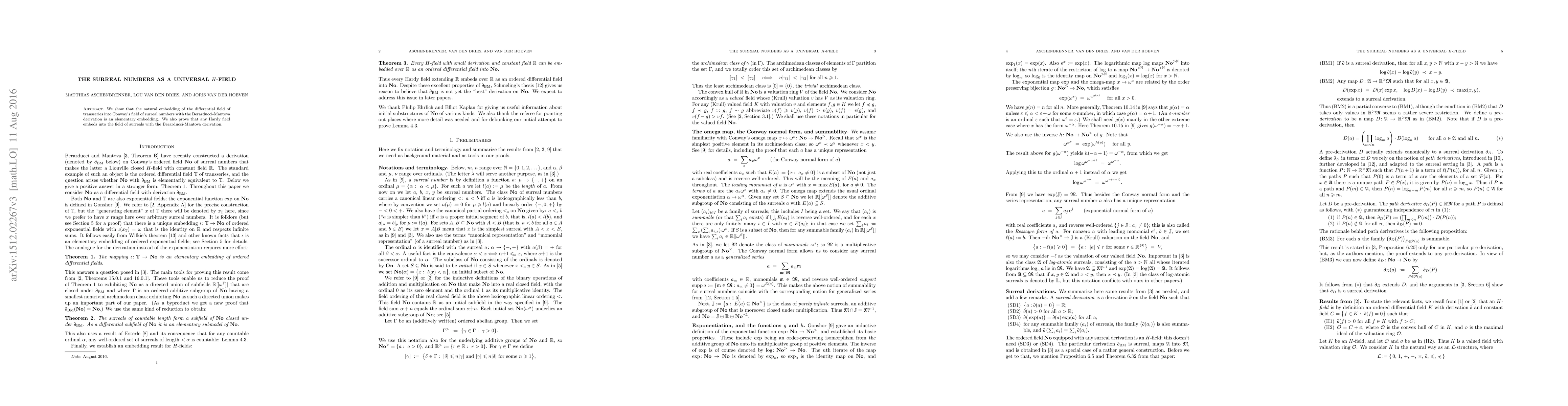 This paper demonstrates that the surreal numbers form a universal H-field, embedding the differential field of transseries and any Hardy field via the Berarducci-Mantova derivation, establishing an elementary embedding.