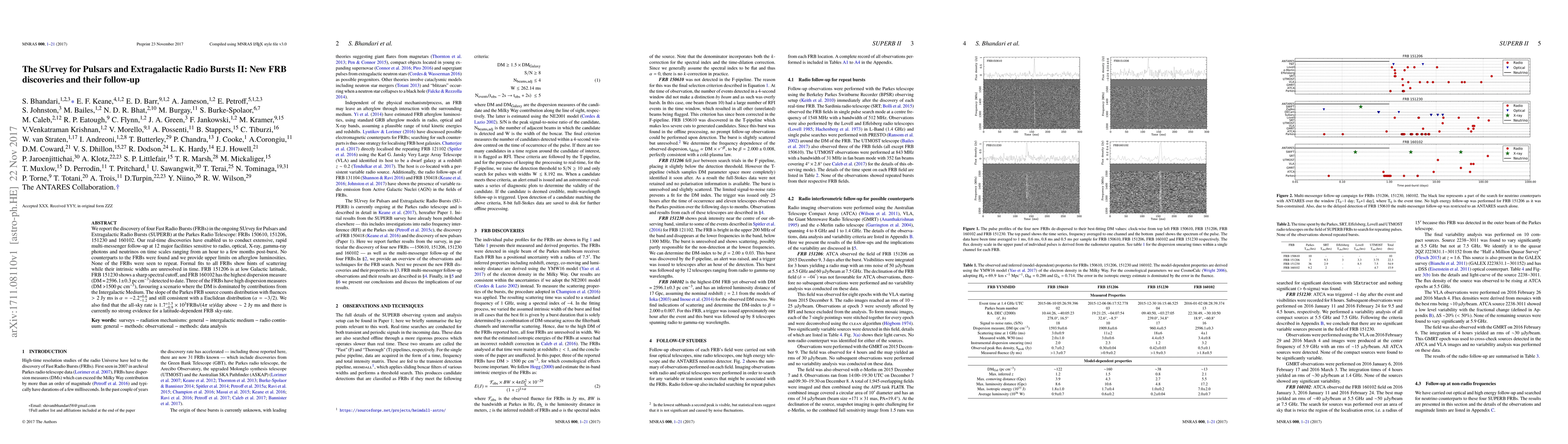 The paper reports the discovery of four new Fast Radio Bursts (FRBs) using the SUPERB survey at the Parkes Radio Telescope, with extensive multi-messenger follow-up conducted at 12 facilities. No counterparts or repeat bursts were found, and high dispersion measures suggest significant contributions from the Intergalactic Medium.