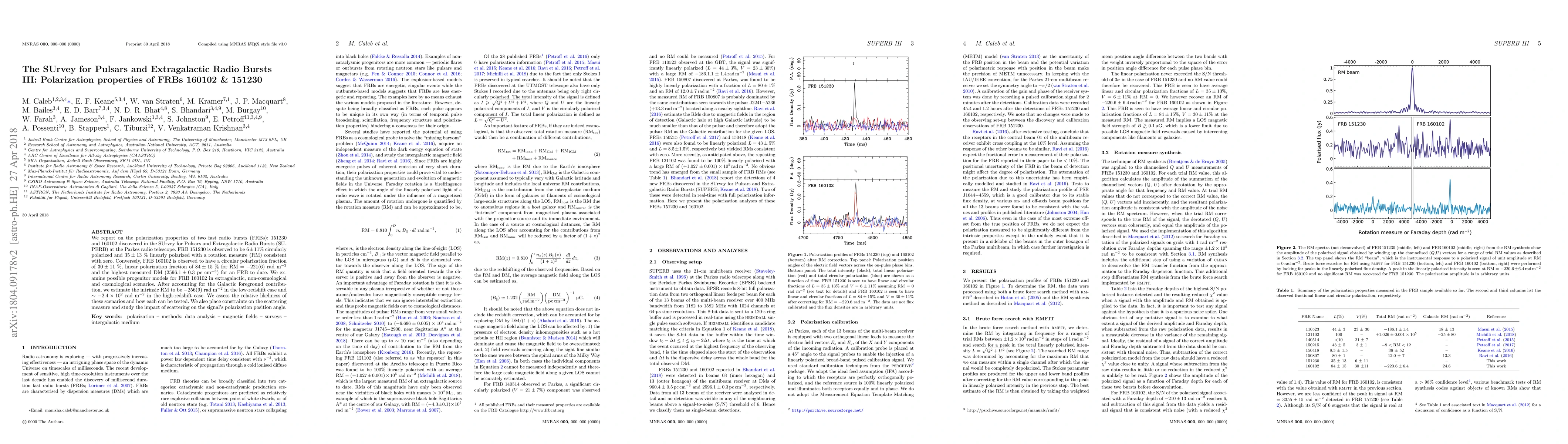 We report on the polarization properties of two fast radio bursts (FRBs): 151230 and 160102 discovered in the SUrvey for Pulsars and Extragalactic Radio Bursts (SUPERB) at the Parkes radio telescope. FRB 151230 is observed to be 6 $\pm$ 11% circularly polarized and 35 $\pm$ 13 % linearly polarized with a rotation measure (RM) consistent with zero. Conversely, FRB 160102 is observed to have a circular polarization fraction of 30 $\pm$ 11 %, linear polarization fraction of 84 $\pm$ 15 % for RM = -221(6) rad m$^{-2}$ and the highest measured DM (2596.1 $\pm$ 0.3 pc cm$^{-3}$) for an FRB to date. We examine possible progenitor models for FRB 160102 in extragalactic, non-cosmological and cosmological scenarios. After accounting for the Galactic foreground contribution, we estimate the intrinsic RM to be -256(9) rad m$^{-2}$ in the low-redshift case and $\sim 2.4 \times 10^{2}$ rad m$^{-2}$ in the high-redshift case. We assess the relative likeliness of these scenarios and how each can be tested. We also place constraints on the scattering measure and study the impact of scattering on the signal's polarization position angle.