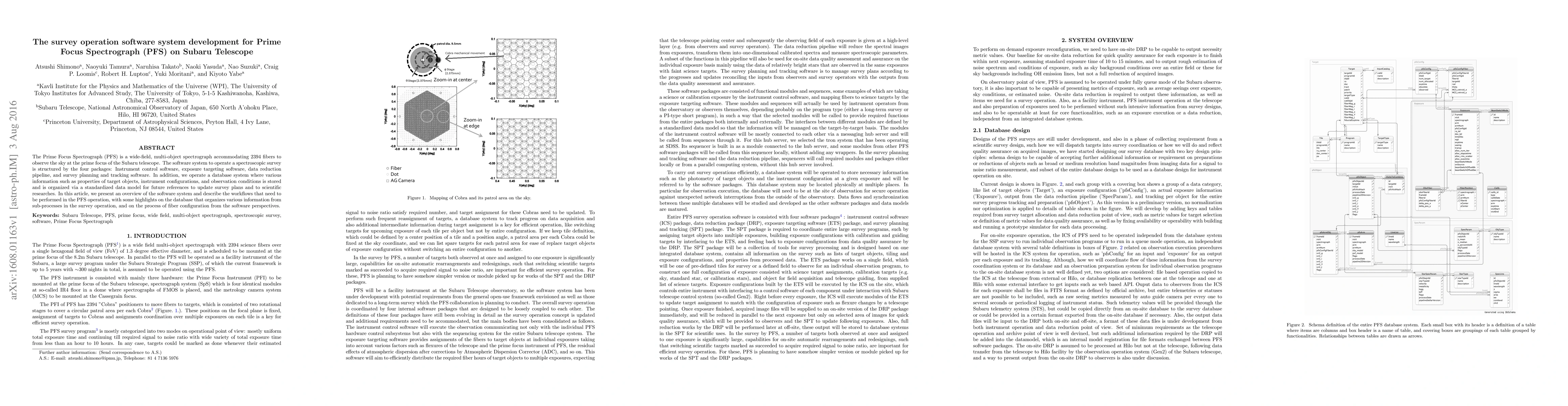 This paper details the development of a comprehensive software system for operating the Prime Focus Spectrograph (PFS) on the Subaru Telescope, comprising four key packages: Instrument control, exposure targeting, data reduction, and survey planning. It also highlights the database system that organizes and stores essential information for future survey updates and scientific research.