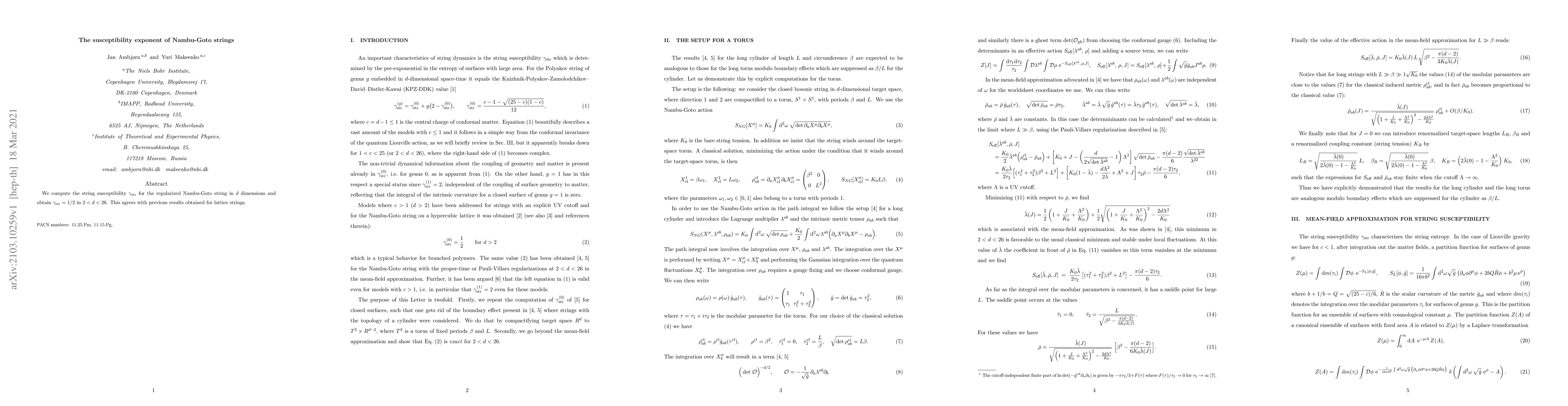 Summary: The study calculates the string susceptibility $\gamma_{str}$ for Nambu-Goto strings in dimensions $2<d<26$ and finds $\gamma_{str}=1/2$, consistent with previous lattice string results. This provides further validation of the behavior of string theories across various dimensions.