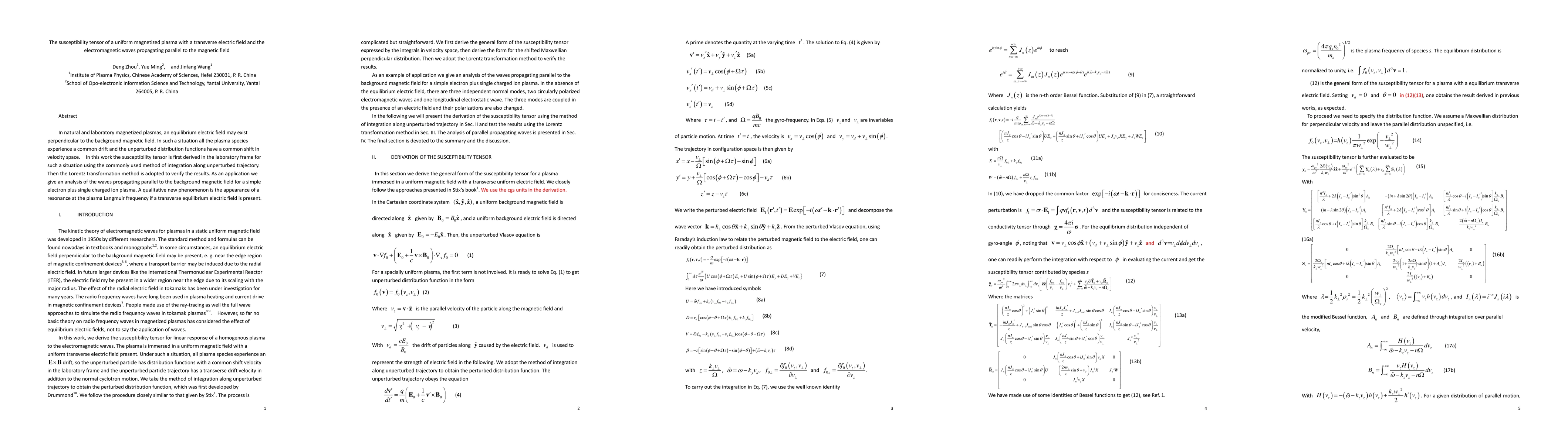 This paper derives the susceptibility tensor for a magnetized plasma with a transverse electric field and investigates the electromagnetic waves propagating parallel to the magnetic field. It reveals a new resonance phenomenon at the plasma Langmuir frequency when a transverse equilibrium electric field exists.