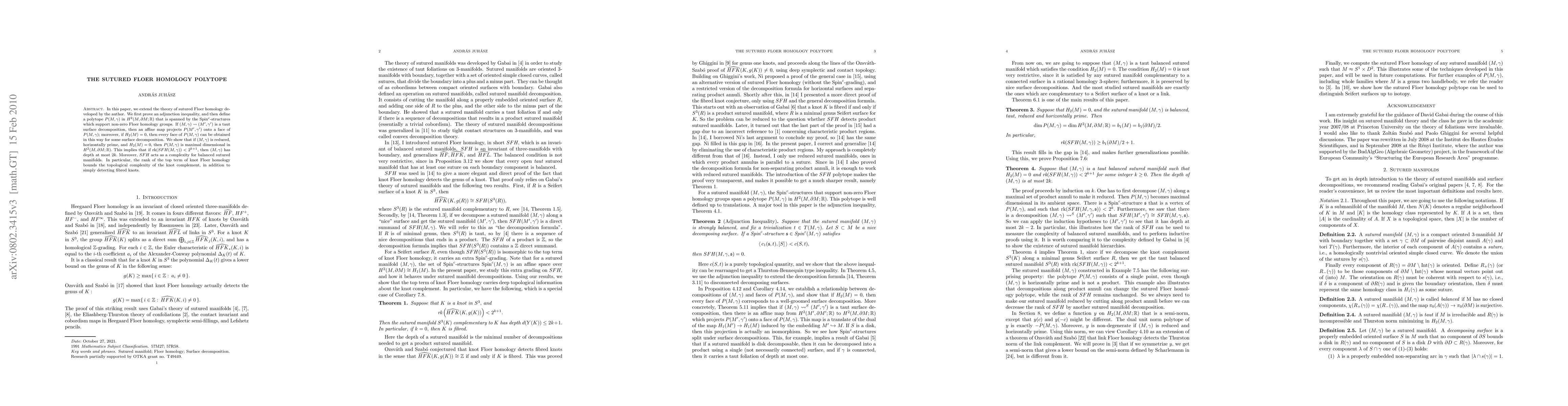 In this paper, we extend the theory of sutured Floer homology developed by the author. We first prove an adjunction inequality, and then define a polytope P(M,g) in H^2(M,\partial M; R) that is spanned by the Spin^c-structures which support non-zero Floer homology groups. If (M,g) --> (M',g') is a taut surface decomposition, then a natural map projects P(M',g') onto a face of P(M,g); moreover, if H_2(M) = 0, then every face of P(M,g) can be obtained in this way for some surface decomposition. We show that if (M,g) is reduced, horizontally prime, and H_2(M) = 0, then P(M,g) is maximal dimensional in H^2(M,\partial M; R). This implies that if rk(SFH(M,g)) < 2^{k+1} then (M,g) has depth at most 2k. Moreover, SFH acts as a complexity for balanced sutured manifolds. In particular, the rank of the top term of knot Floer homology bounds the topological complexity of the knot complement, in addition to simply detecting fibred knots.