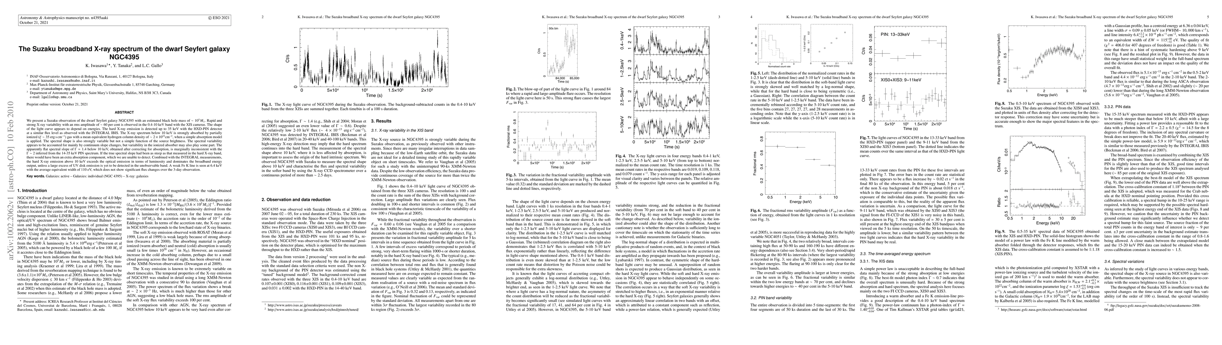 We present a Suzaku observation of the dwarf Seyfert galaxy NGC4395 with an estimated black hole mass of ~10^5 Msun. Rapid and strong X-ray variability with an rms amplitude of ~60 per cent is observed in the 0.4-10 keV band with the XIS cameras. The shape of the light curve appears to depend on energies. The hard X-ray emission is detected up to 35 keV with the HXD-PIN detector at a similar flux level as observed with the INTEGRAL IBIS. The X-ray spectrum below 10 keV is strongly absorbed by partially ionized (xi~35) gas with a mean equivalent hydrogen column density of ~2e22 cm^-2, when a simple absorption model is applied. The spectral shape is also strongly variable but not a simple function of the source brightness. The spectral variability appears to be accounted for mainly by continuum slope changes, but variability in the ionized absorber may also play some part. The apparently flat spectral slope with photon index of 1.4 below 10 keV, obtained after correcting for absorption, is marginally inconsistent with the photon index of 2 inferred from the 14-35 keV PIN spectrum. If the true spectral slope was as steep as that measured in the hard X-ray band, there would be an extra absorption component, which we are unable to detect. Combined with the INTEGRAL measurements, the hard X-ray emission above 10 keV exceeds the optical emission in terms of luminosity and dominates the broadband energy output, unless a large excess of UV disk emission is yet to be detected in the unobservable band. A weak Fe K line is seen at 6.4 keV with the average equivalent width of 110 eV, which does not show clear flux changes over the 3-day observation.