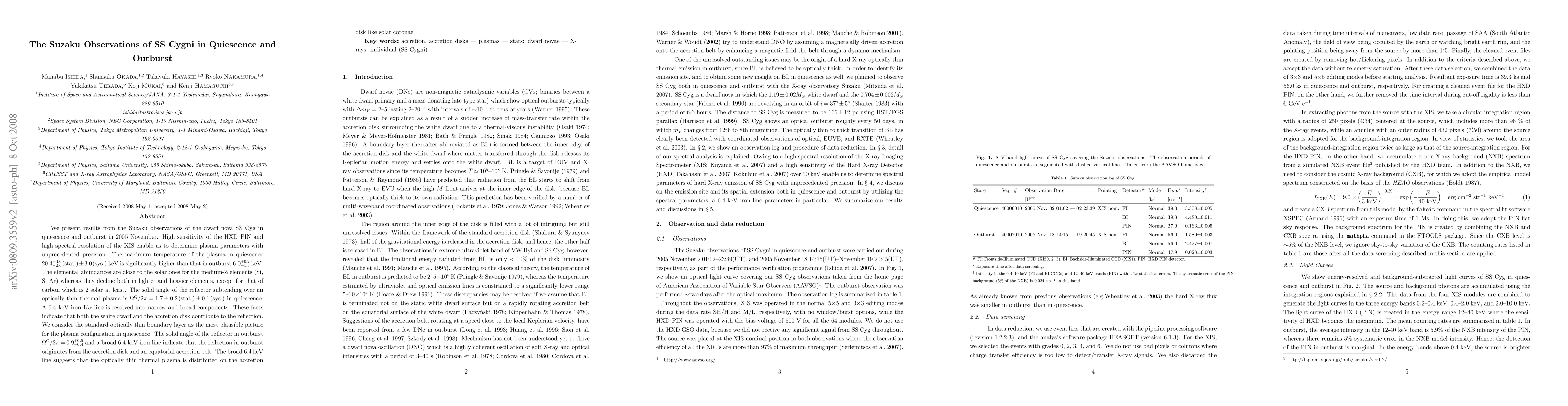 We present results from the Suzaku observations of the dwarf nova SS Cyg in quiescence and outburst in 2005 November. Owing to high sensitivity of the HXD PIN detector and high spectral resolution of the XIS, we have determined parameters of the plasma with unprecedented precision. The maximum temperature of the plasma in quiescence 20.4 +4.0-2.6 (stat.) +/- 3.0 (sys.) keV is significantly higher than that in outburst 6.0 +0.2-1.3 keV. The elemental abundances are close to the solar ones for the medium-Z elements (Si, S, Ar) whereas they decline both in lighter and heavier elements. Those of oxygen and iron are 0.46 and 0.37 solar, respectively. That of carbon is exceptionally high and 2 solar at least. The solid angle of the reflector subtending over the optically thin thermal plasma is Omega/2\pi = 1.7+/-0.2 (stat.) +/-0.1 (sys.) in quiescence. A 6.4 keV iron Ka line is resolved into a narrow and broad components. These facts indicate that both the white dwarf and the accretion disk contribute to the continuum reflection and the 6.4 keV iron Ka line. We consider the standard optically thin boundary layer as the most plausible picture for the plasma configuration in quiescence. The solid angle of the reflector in outburst Omega/2\pi = 0.9 +0.5-0.4 and a broad 6.4 keV iron line indicates that the reflection in outburst originates from the accretion disk and an equatorial accretion belt. From the energy width of the 6.4 keV line, we consider the optically thin thermal plasma in outburst as being distributed on the accretion disk like solar coronae.