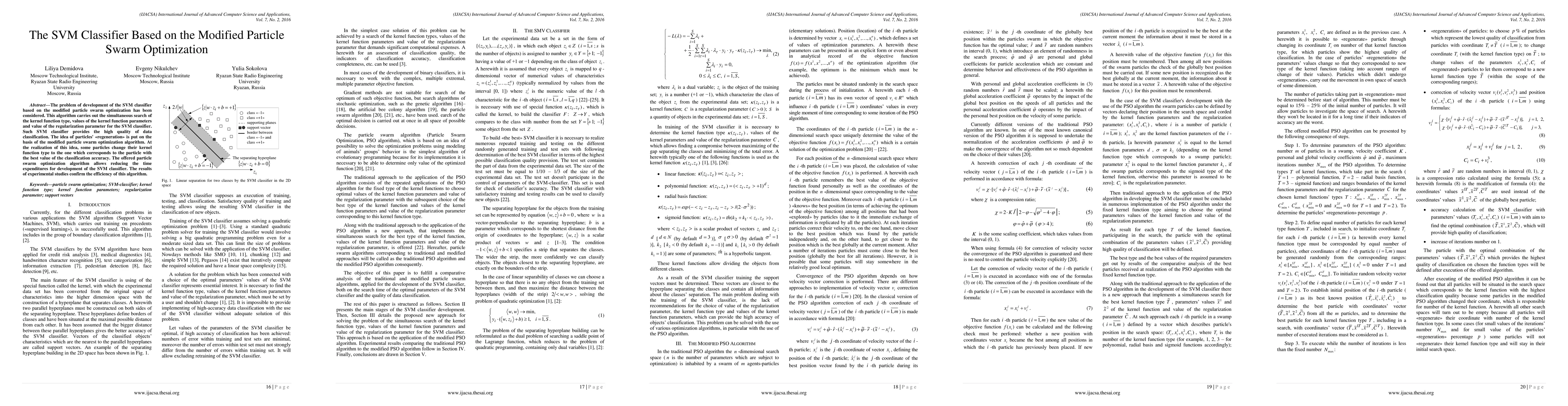 This paper proposes an SVM classifier enhanced by a modified particle swarm optimization algorithm that simultaneously searches for the optimal kernel function type, parameters, and regularization parameter. The algorithm includes a "regeneration" concept where particles update their kernel functions based on the best-performing particle, improving classification accuracy and reducing development time. Experimental results validate the algorithm's efficiency.